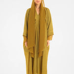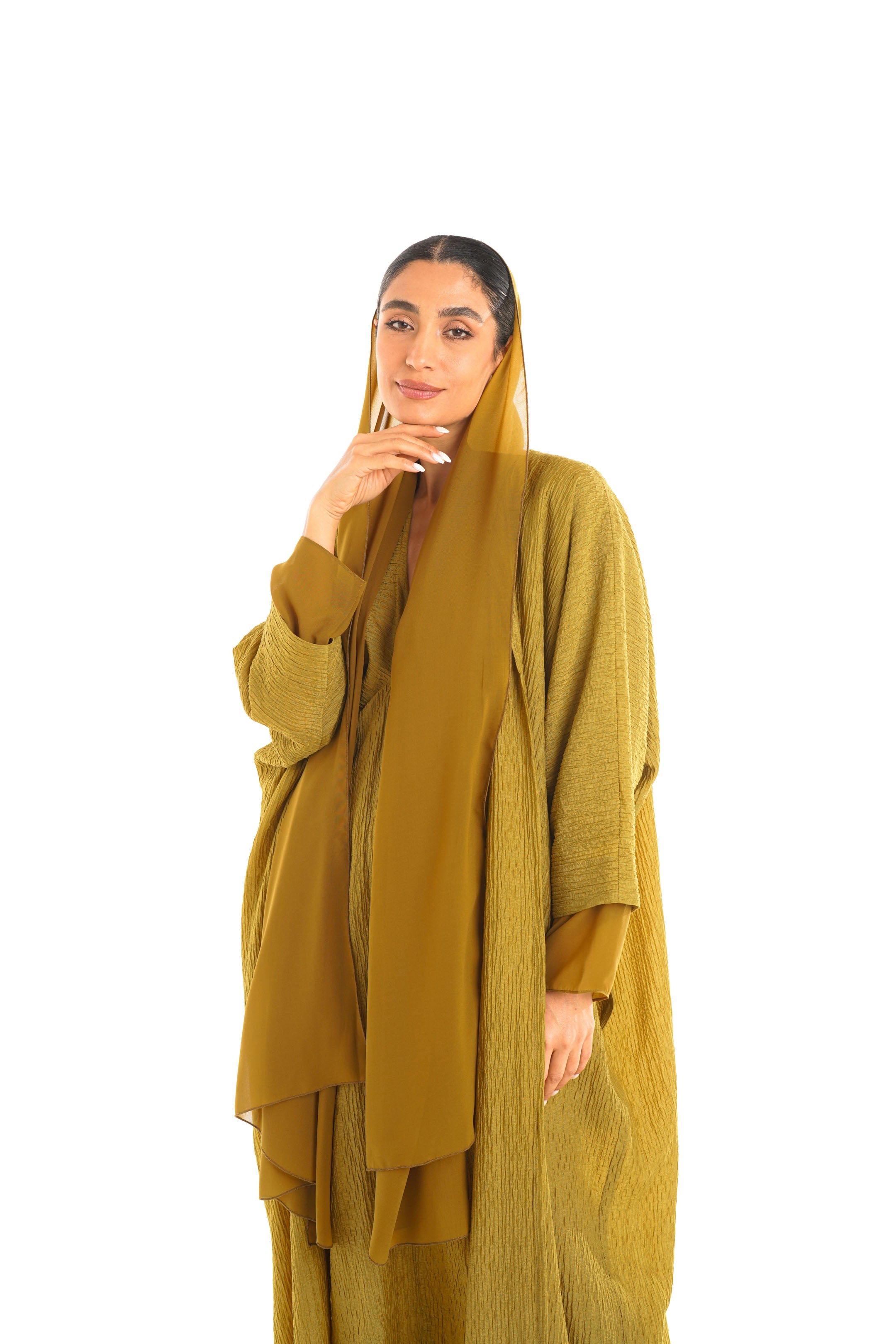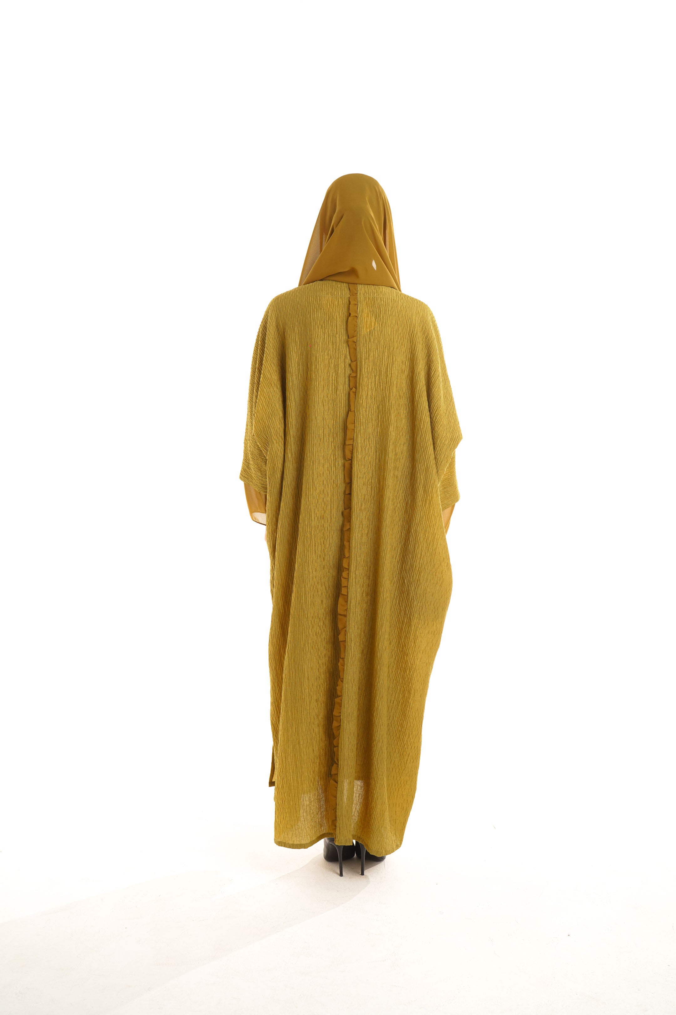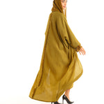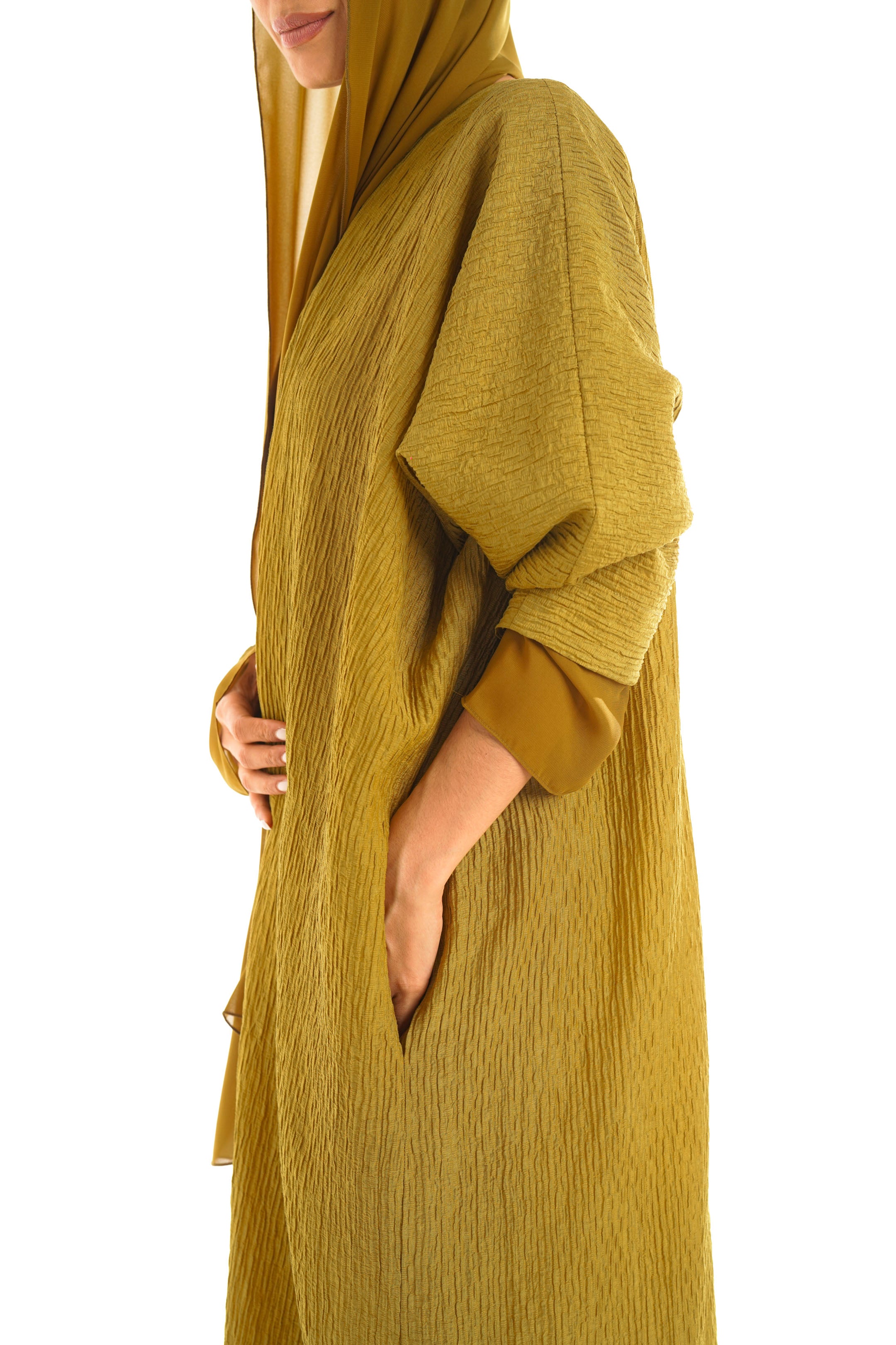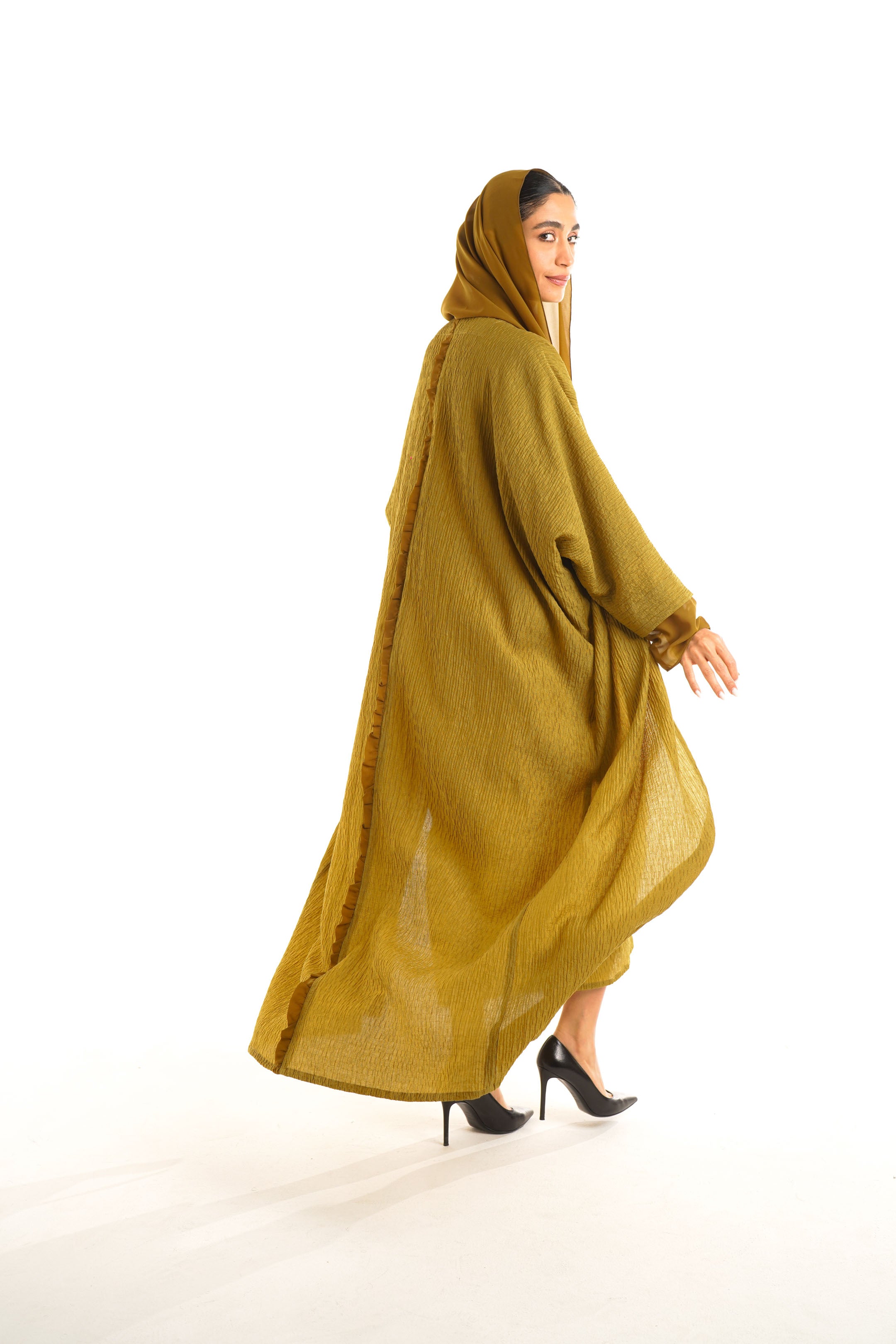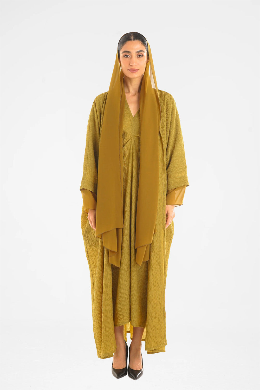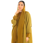 The gazelle abaya represents a fusion of luxurious material with a contemporary-inspired design, using the finest crushed crepe, and flowing chiffon on the sleeves to create a flowy silhouette in the form of an Abaya. This mood-boosting colour and design will lift your evening or day spirit, especially when paired with our loved woven slipper.