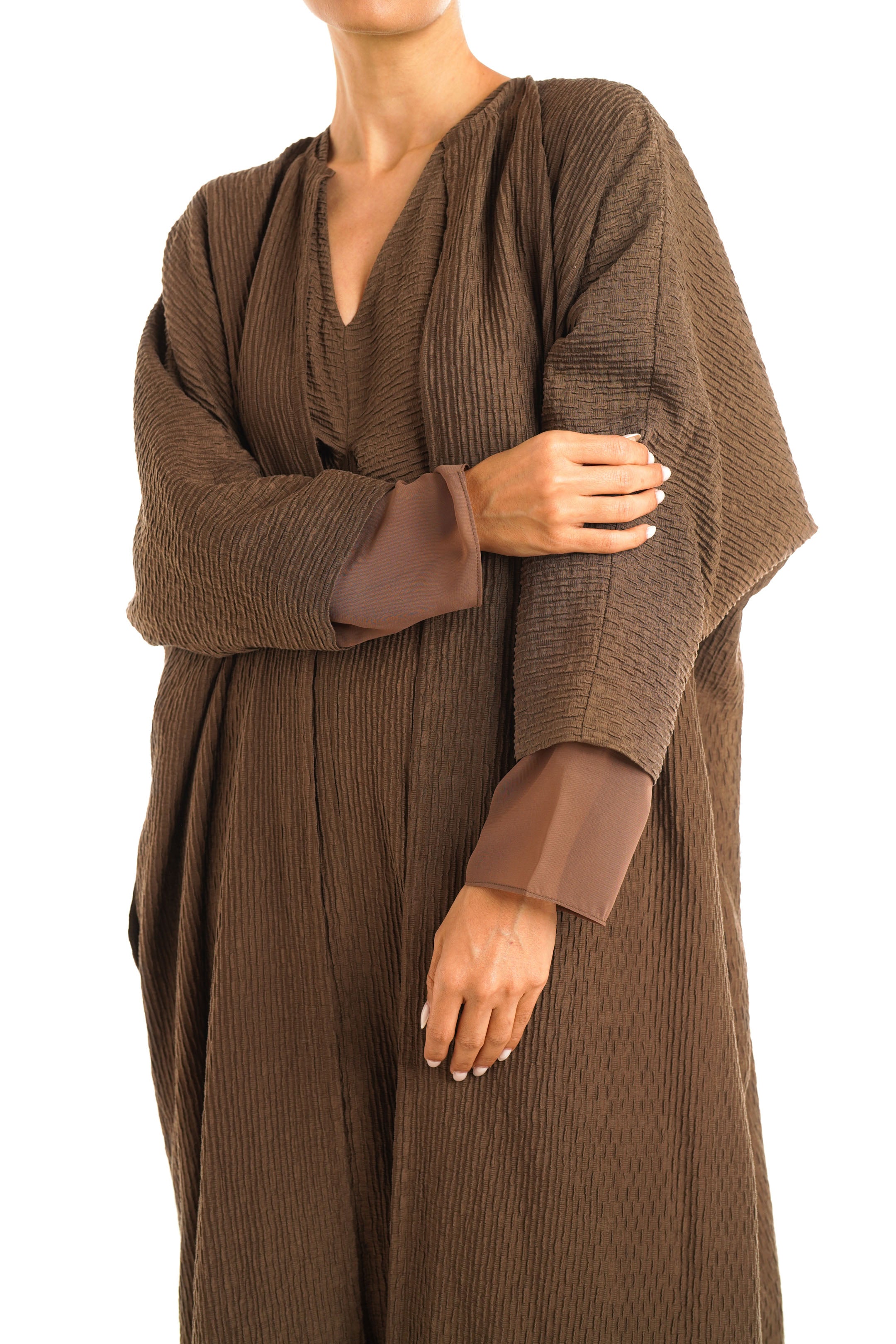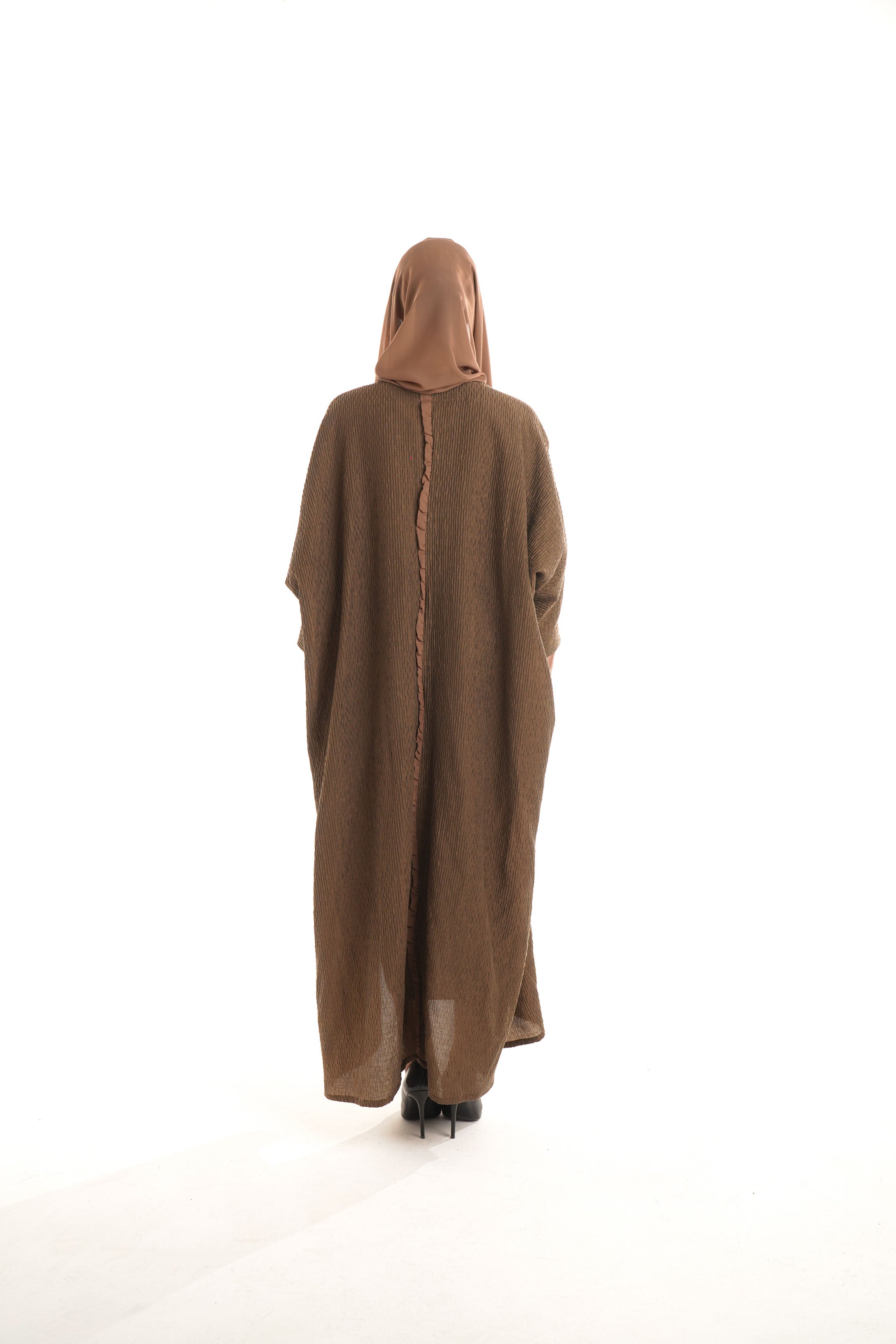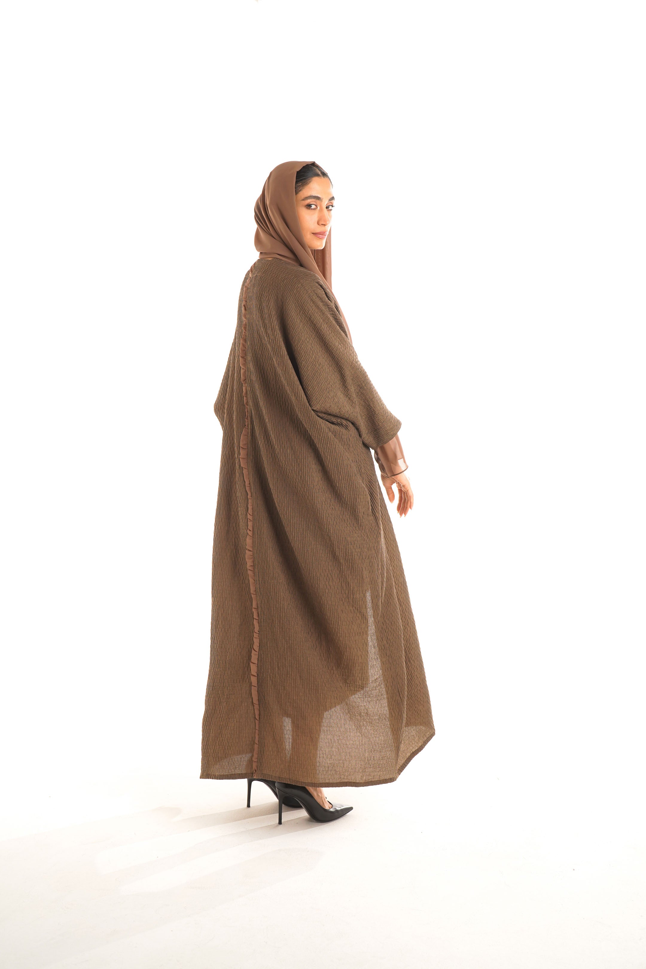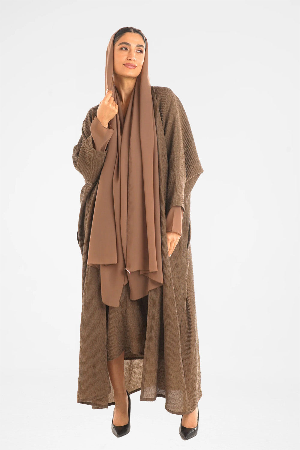 The gazelle abaya represents a fusion of luxurious material with a contemporary-inspired design, using the finest crushed crepe, and flowing chiffon on the sleeves to create a flowy silhouette in the form of an Abaya. This mood-boosting color and design will lift your evening or day spirit, especially when paired with our loved woven slipper.
