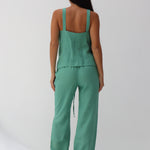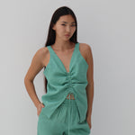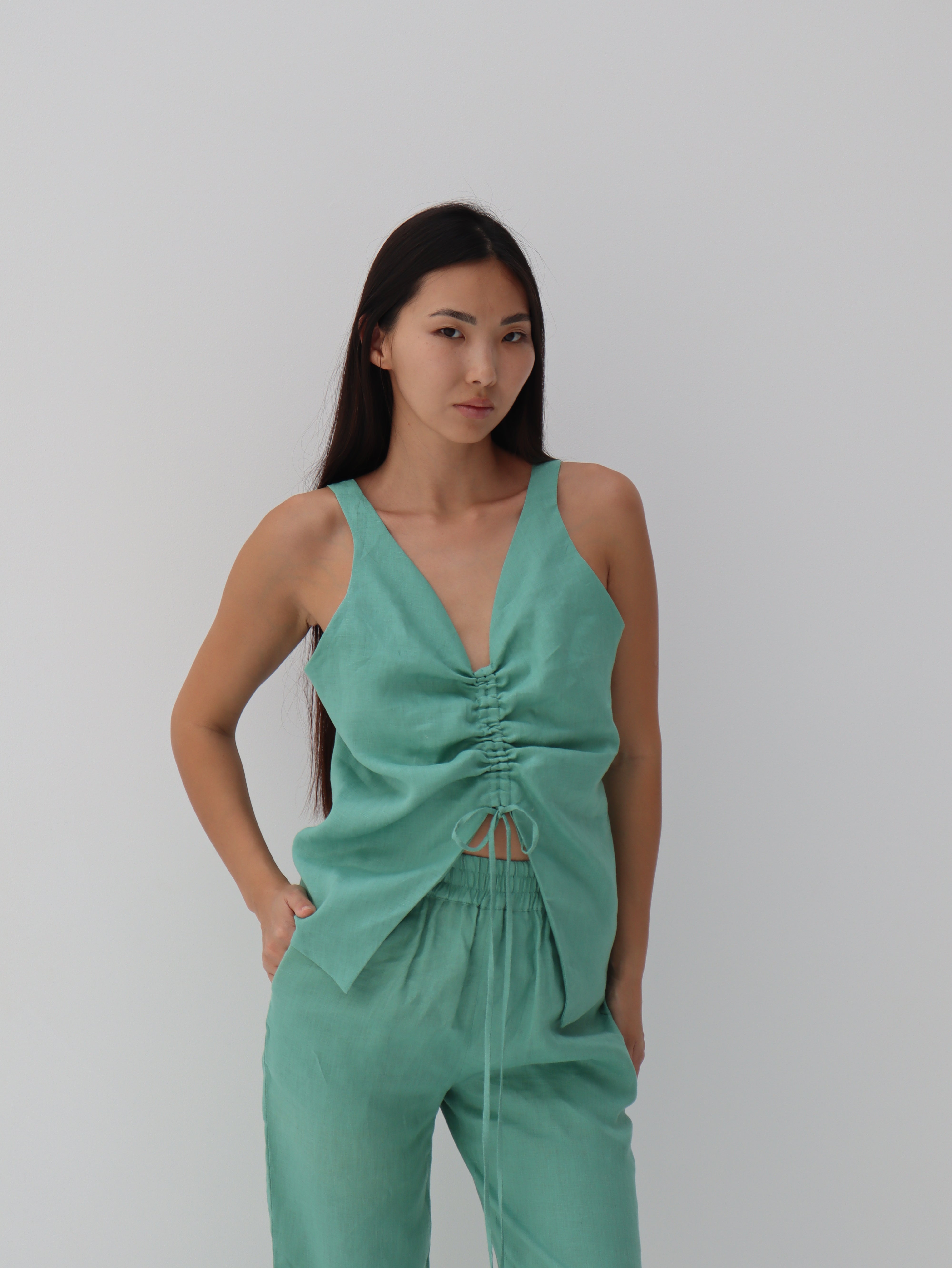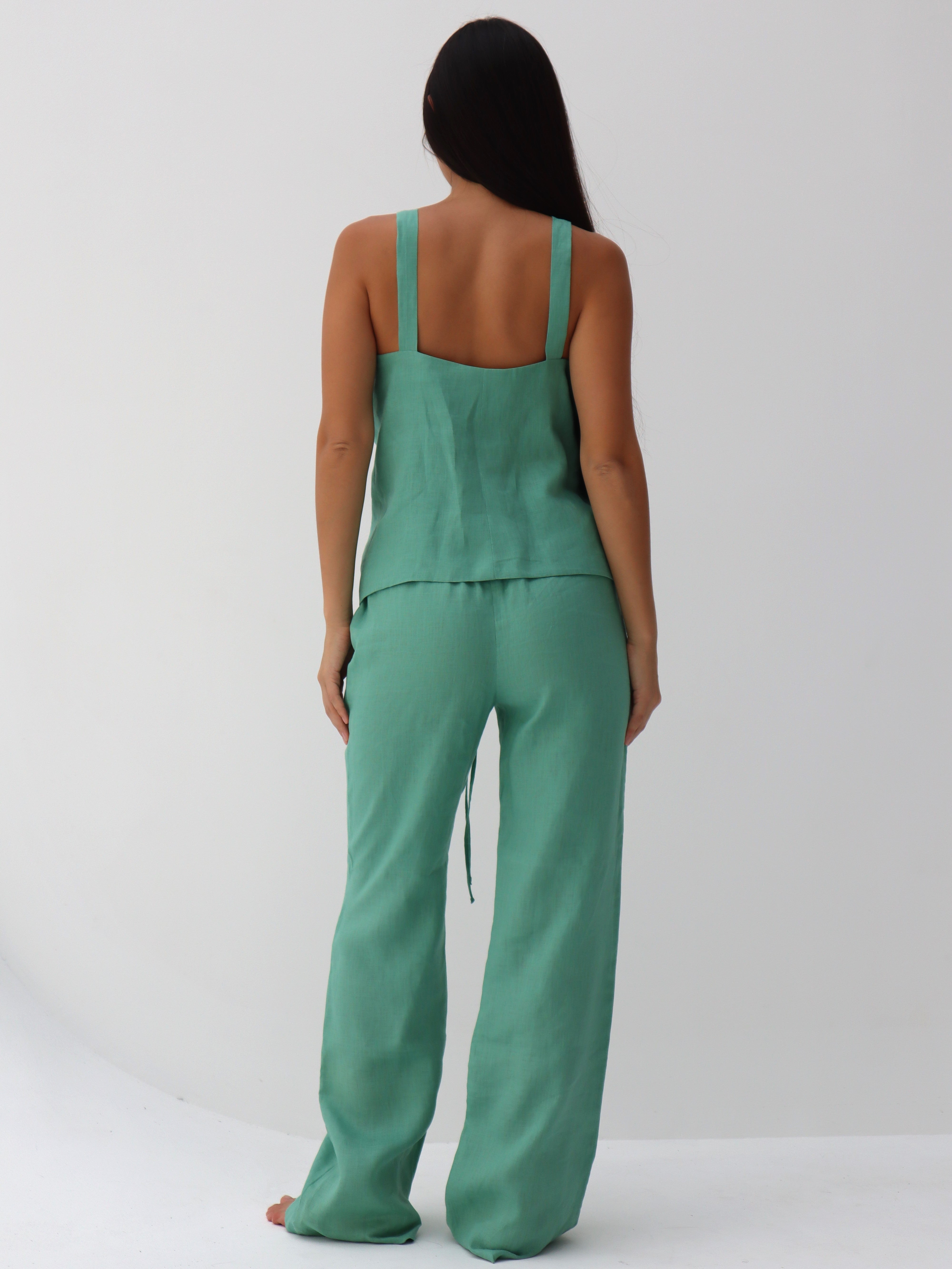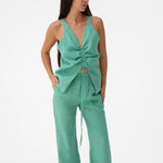 This top & pants set can be slipped on for casual day look or, at a beach party. Made from a linen-viscose blend, the top has a butterfly-shape with front panel tie-up straps and a slit.