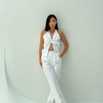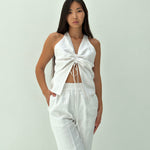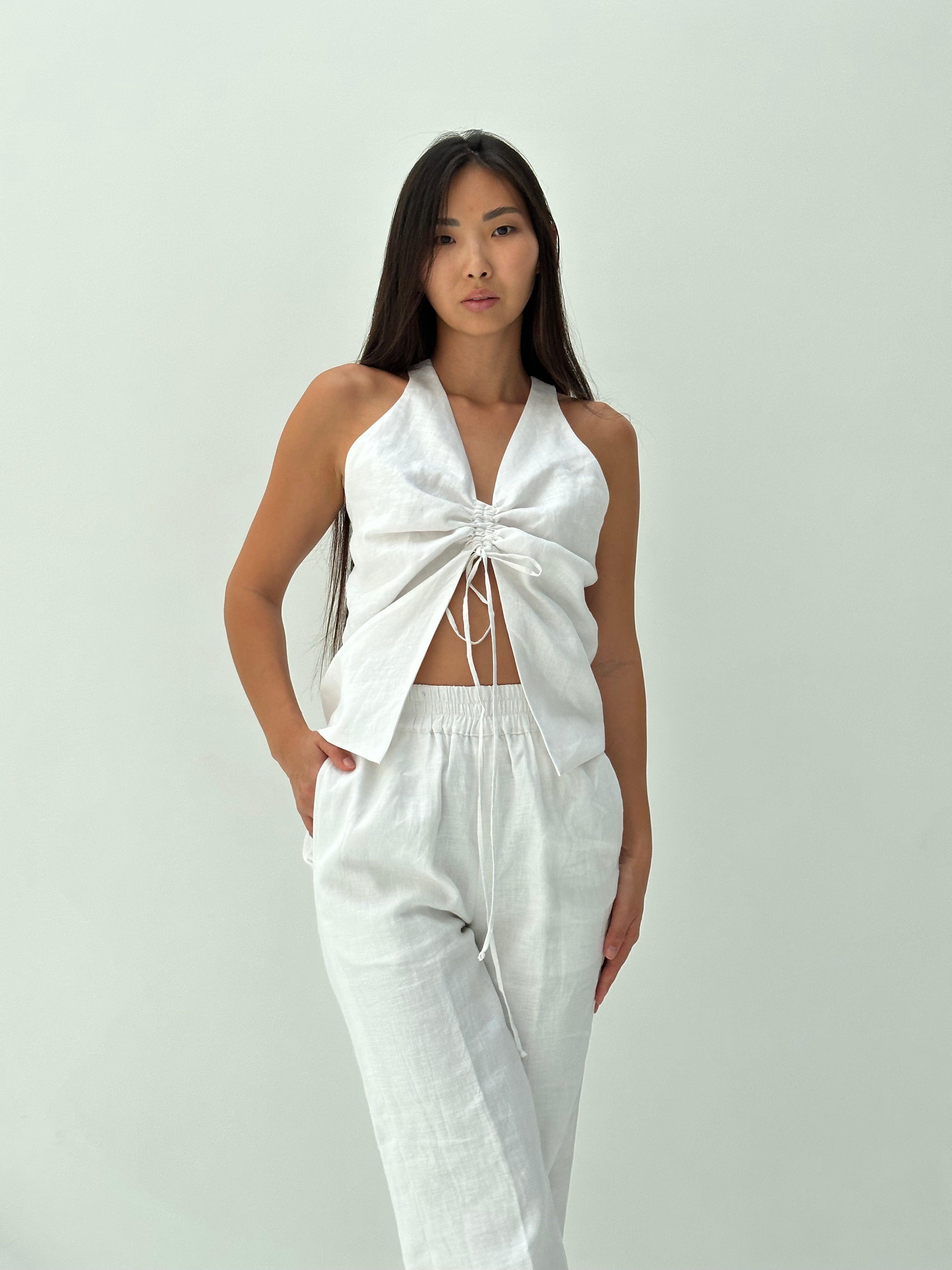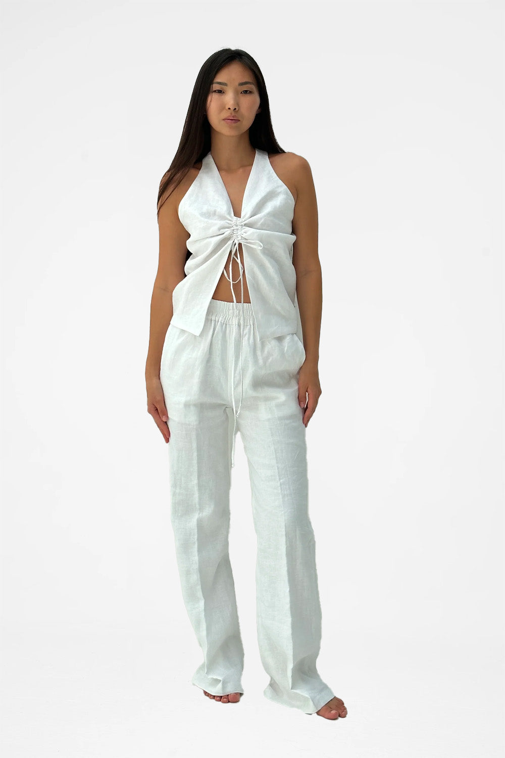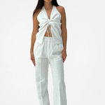 This top & pants set can be slipped on for a casual day look or, at a beach party. Made from a linen-viscose blend, the top has a butterfly shape with front panel tie-up straps and a slit.