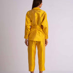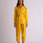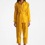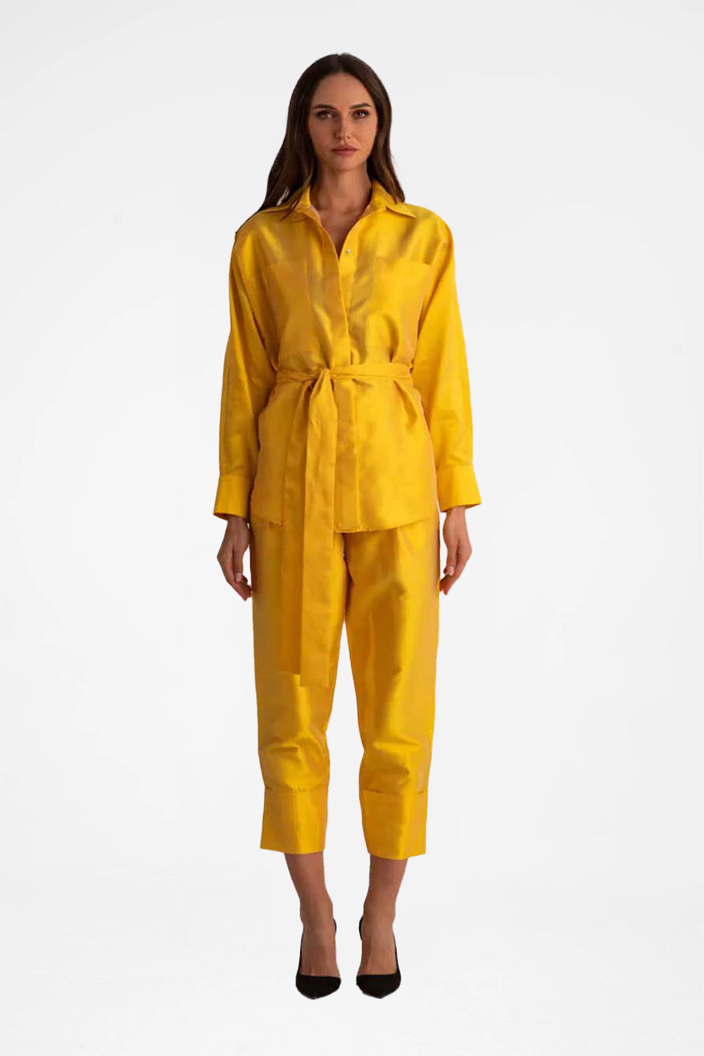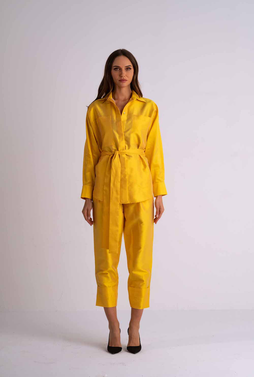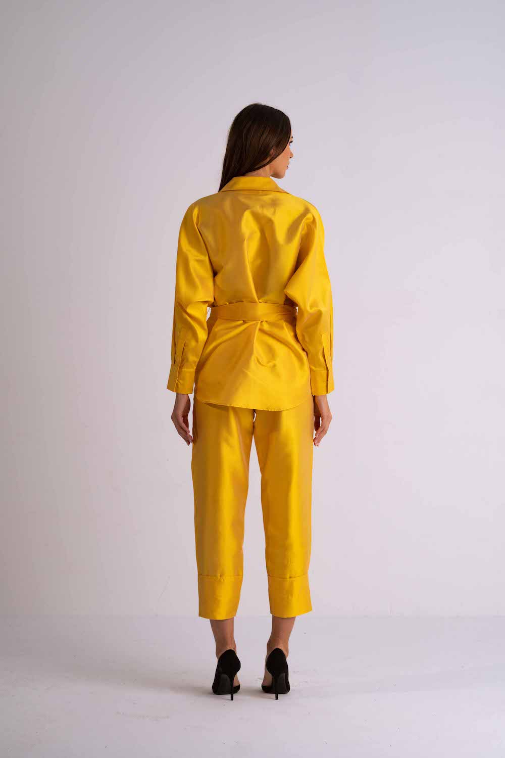 This chic set is inspired by the beauty of the Jungle. With the stunning Yellow safari outfit you can feel both comfortable and bohemian no matter what day brings you. The set is made from raw silk and has a glistening metallic finish. The jacket can be worn on it's own as a blouse or as a layering jacket with crop top. It features detachable belt that holds the waist in place and two front pockets on the chest.