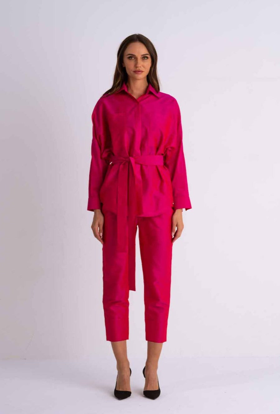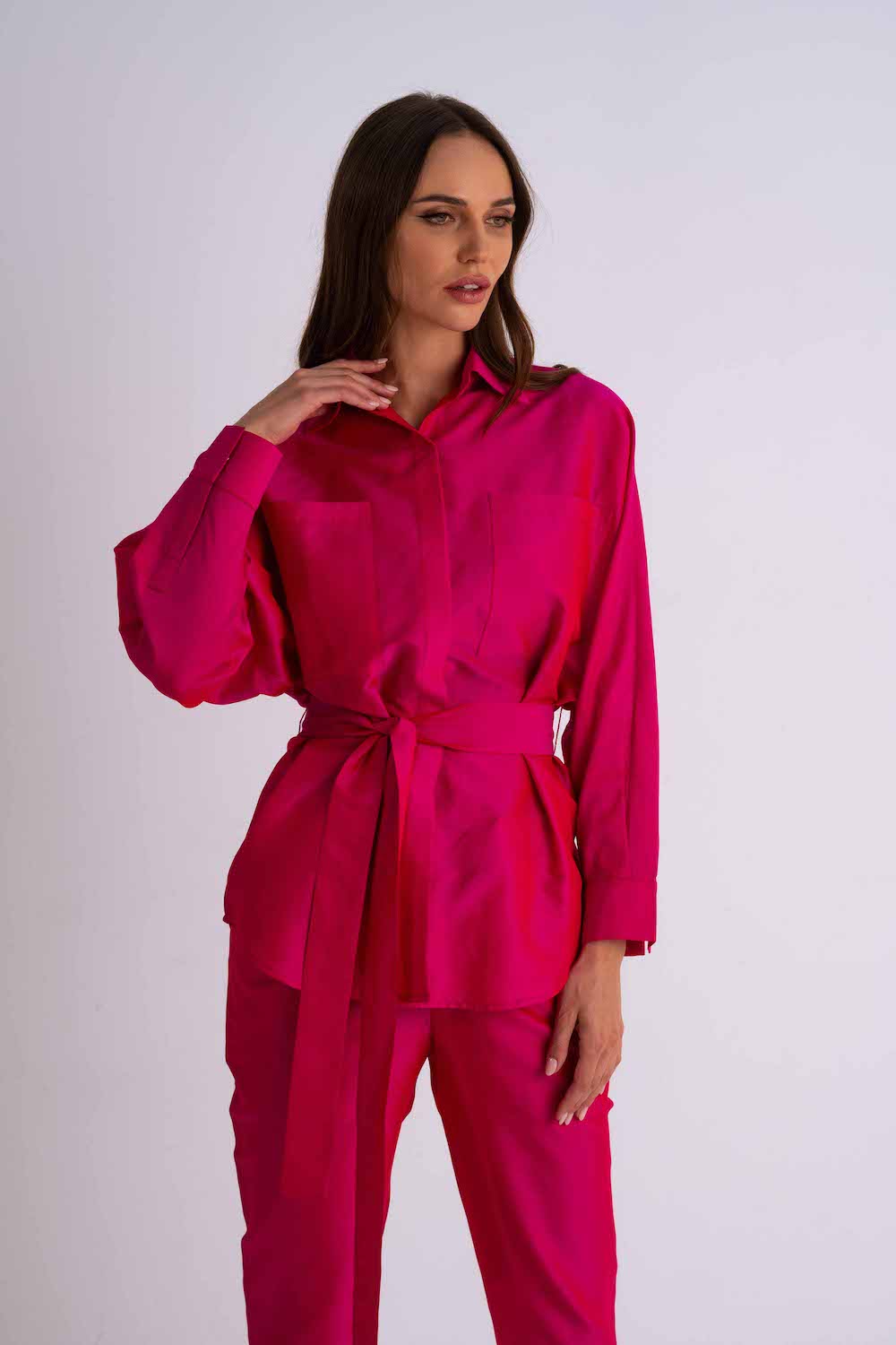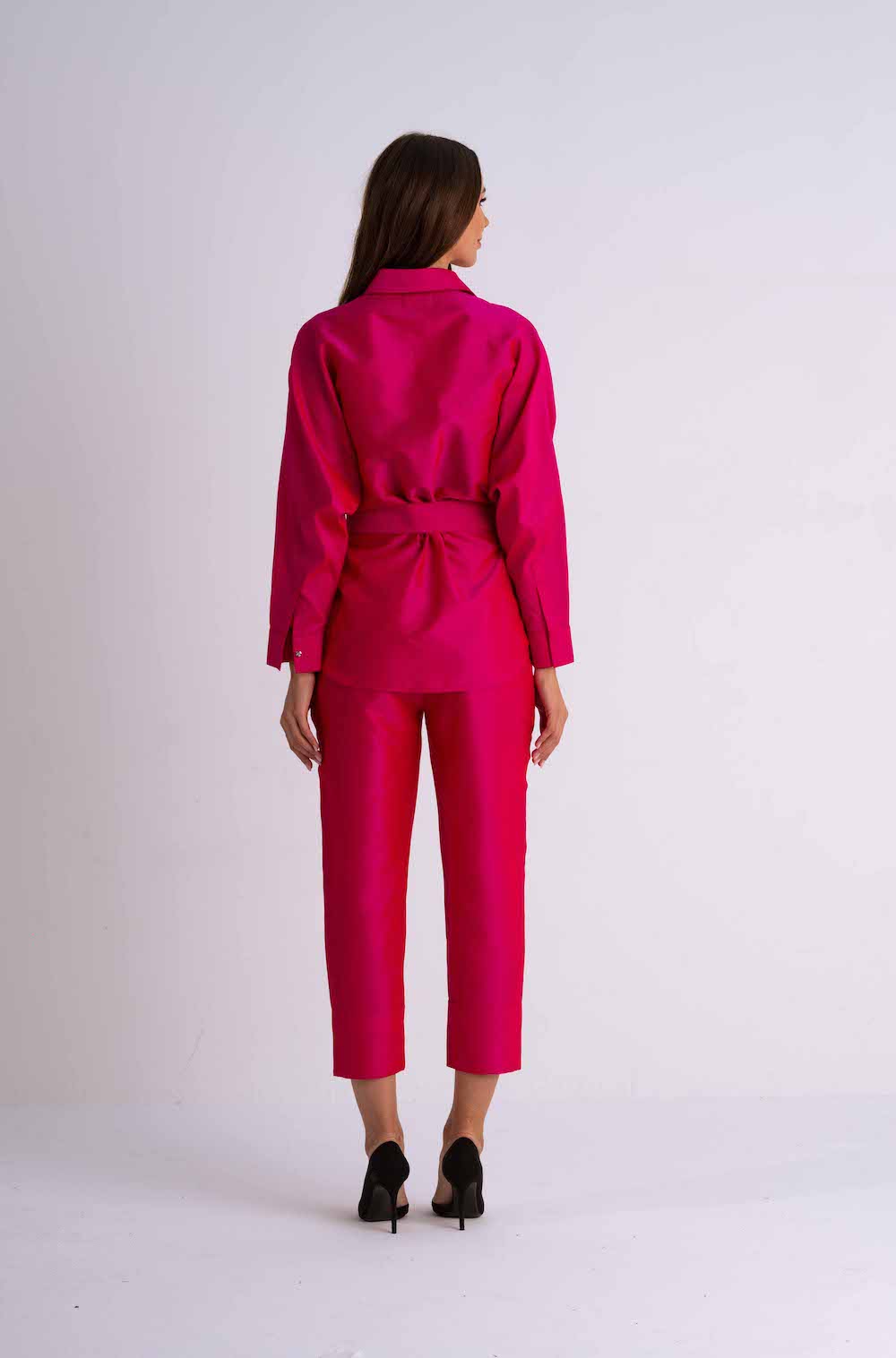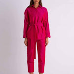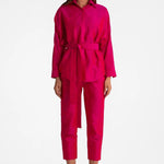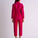This chic set is inspired by the beauty of the Jungle. With the stunning Pink safari outfit you can feel both comfortable and bohemian no matter what day brings you. The set is made from raw silk and has a glistening metallic finish. The jacket can be worn on it's own as a blouse or as a layering jacket with crop top. It features detachable belt that holds the waist in place and two front pockets on the chest.