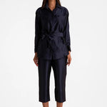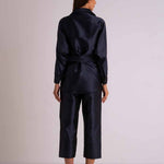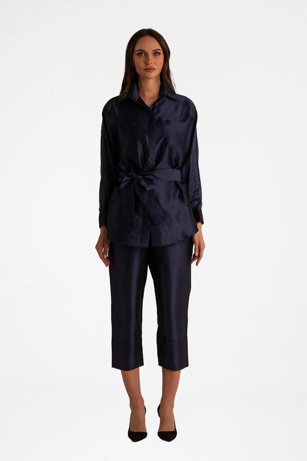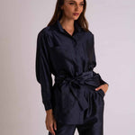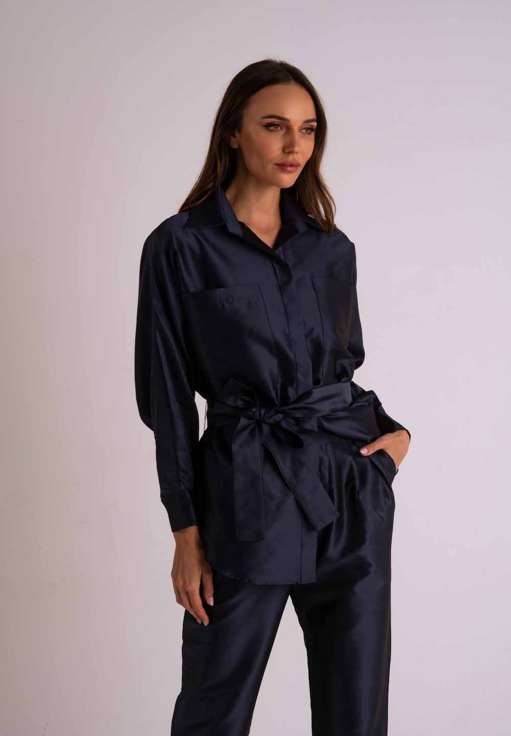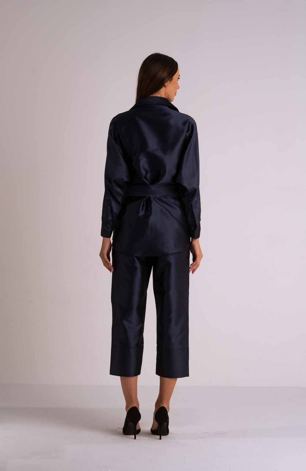 This chic set is inspired by the beauty of the Jungle. With the stunning Navy safari outfit you can feel both comfortable and bohemian no matter what day brings you. The set is made from raw silk and has a glistening metallic finish. The jacket can be worn on it's own as a blouse or as a layering jacket with crop top. It features detachable belt that holds the waist in place and two front pockets on the chest.
