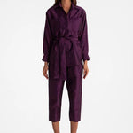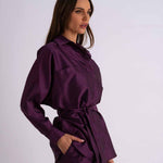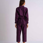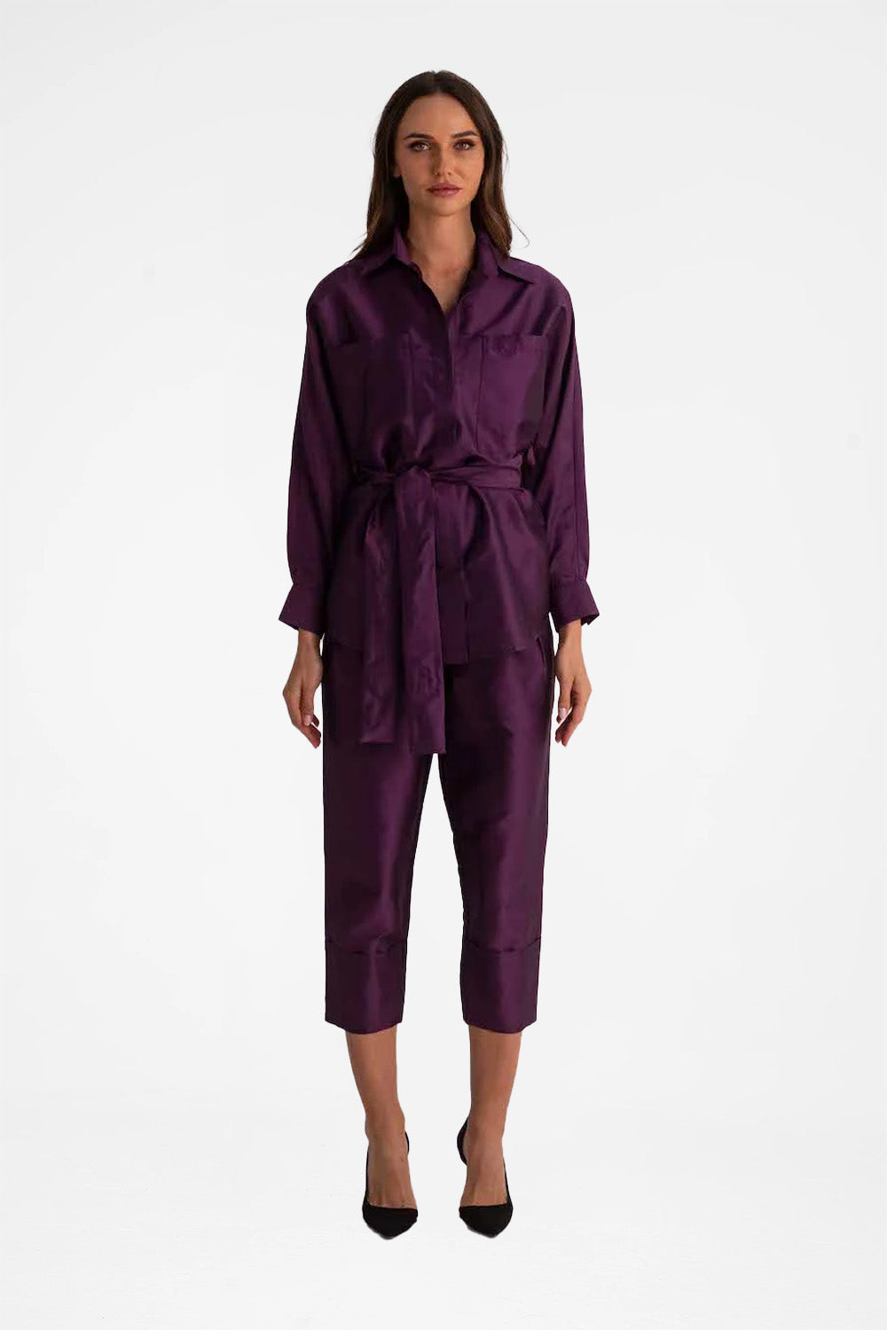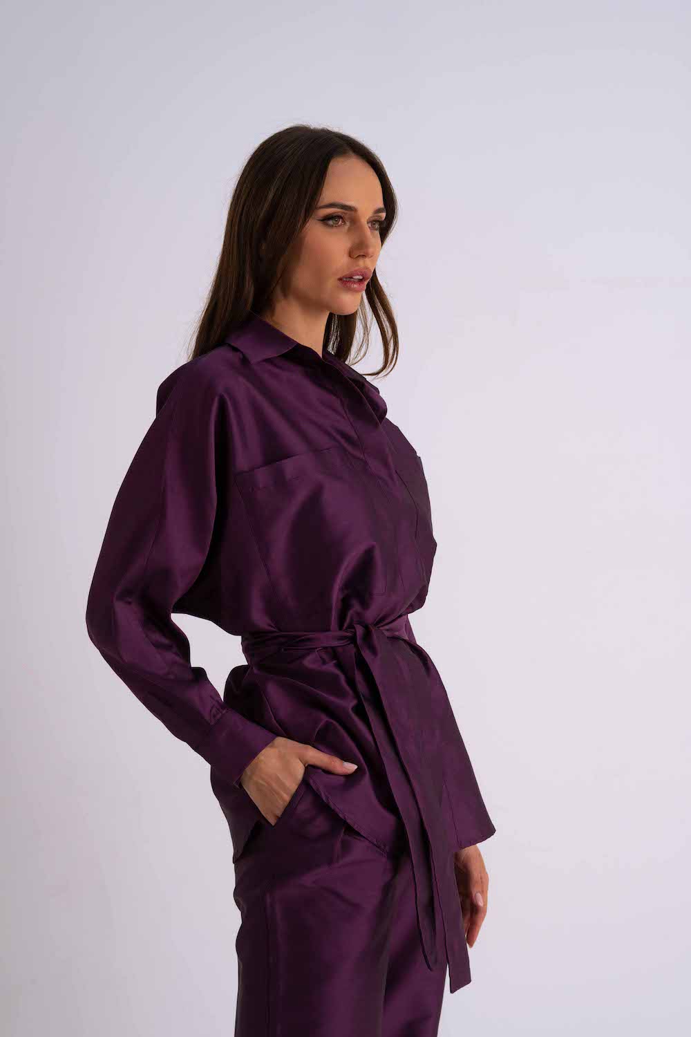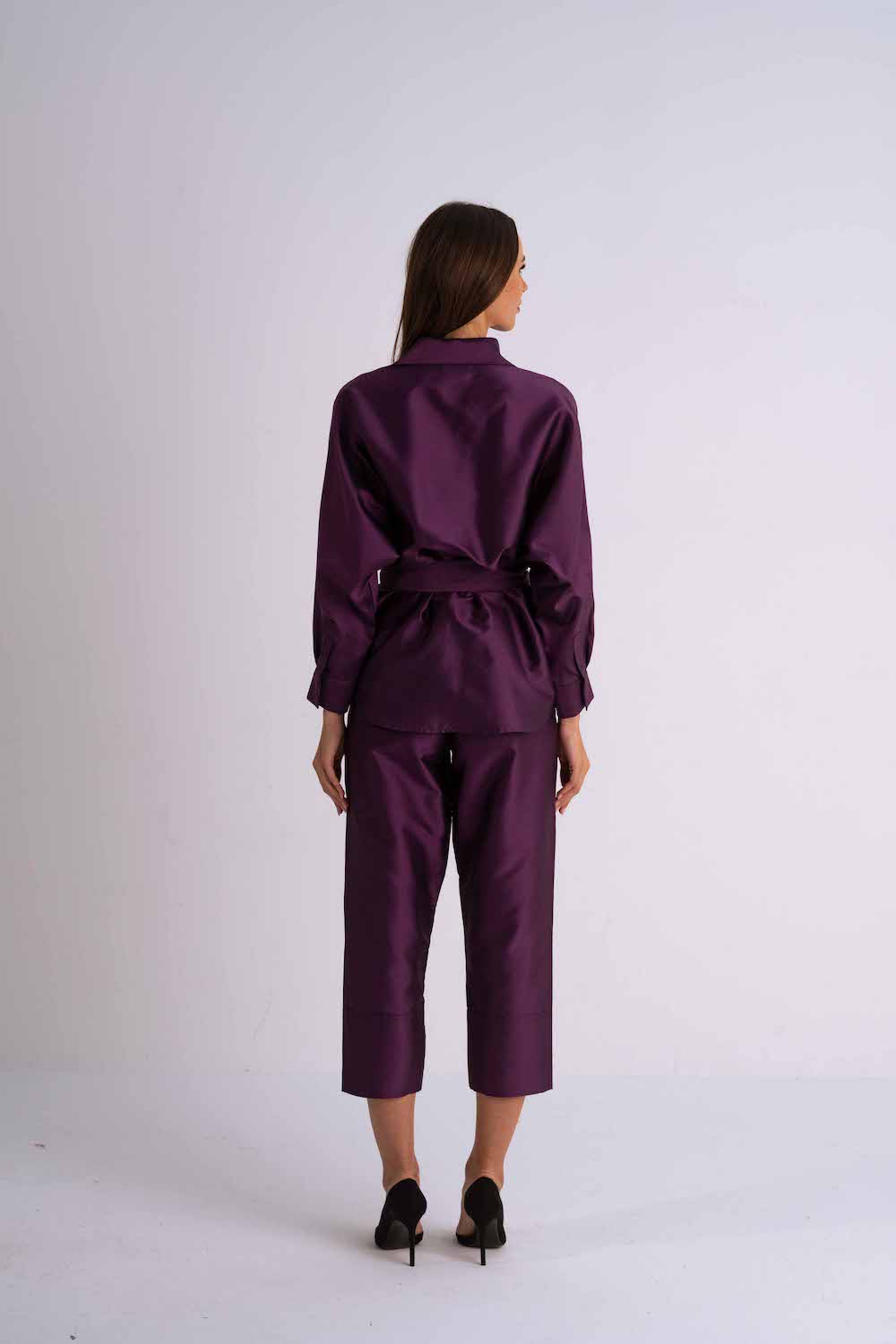 This chic set is inspired by the beauty of the Jungle. With the stunning Purple safari outfit you can feel both comfortable and bohemian no matter what day brings you. The set is made from raw silk and has a glistening metallic finish. The jacket can be worn on it's own as a blouse or as a layering jacket with crop top. It features detachable belt that holds the waist in place and two front pockets on the chest.