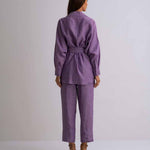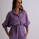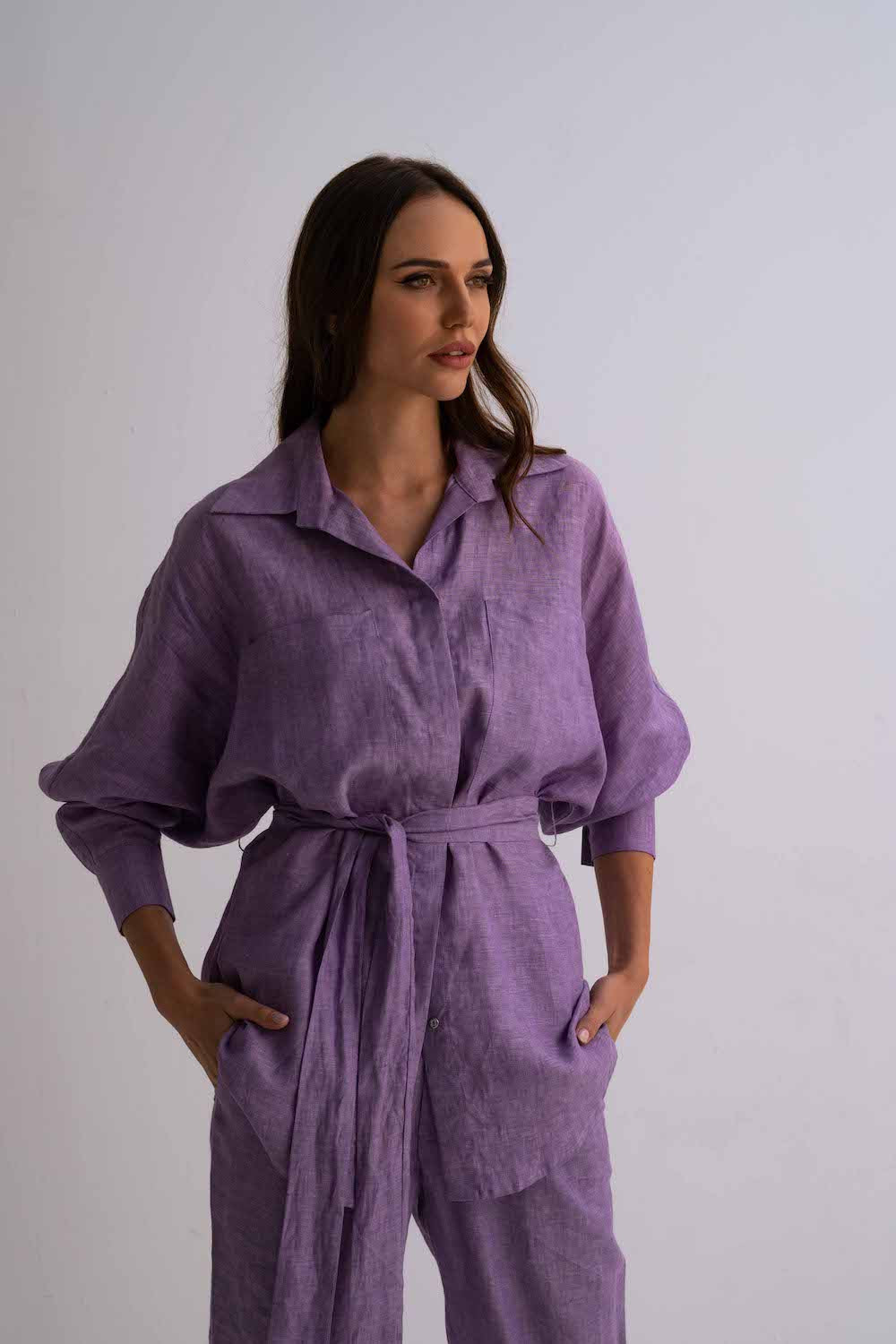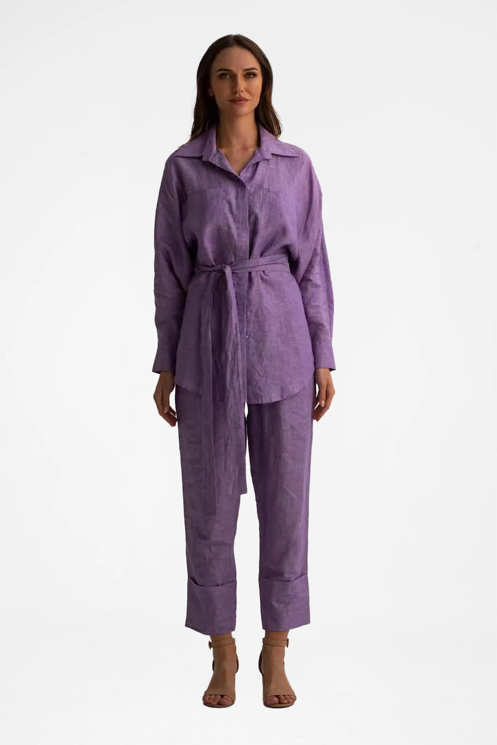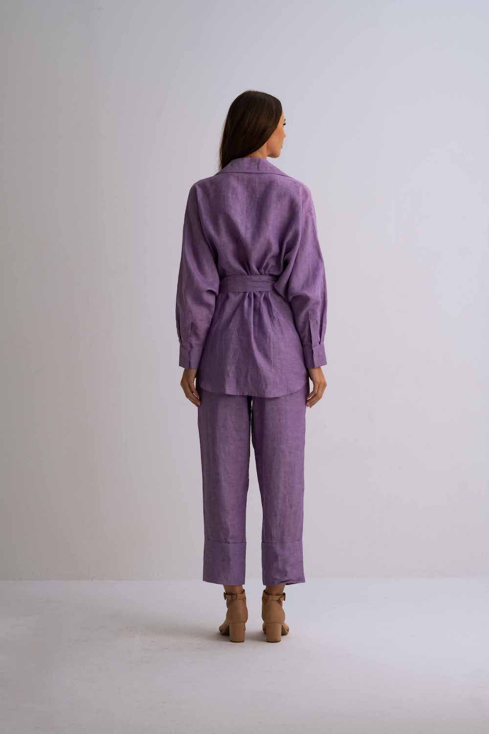 This chic set is inspired by the beauty of the Jungle. With the stunning design and soft linen material of this outfit. The jacket can be worn on its own as a blouse or as a layering jacket with a crop top. It features a detachable belt that holds the waist in place and two front pockets on the chest.