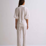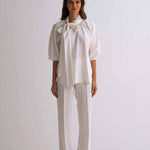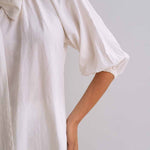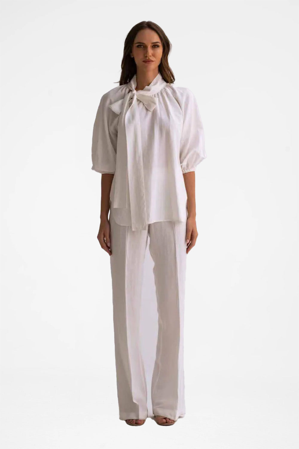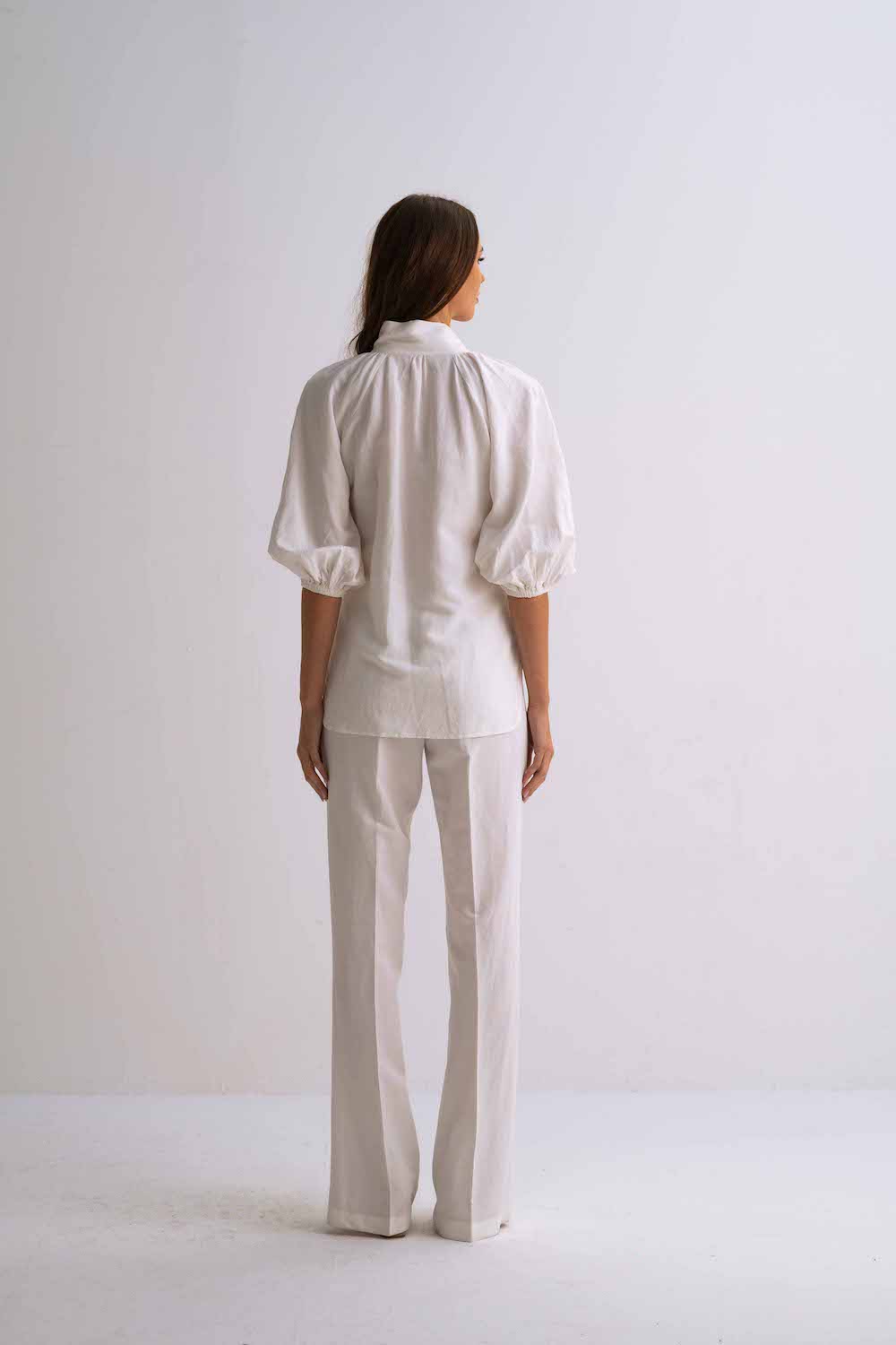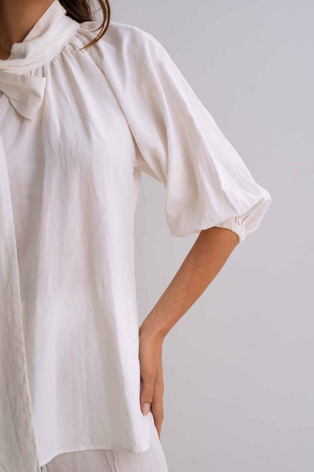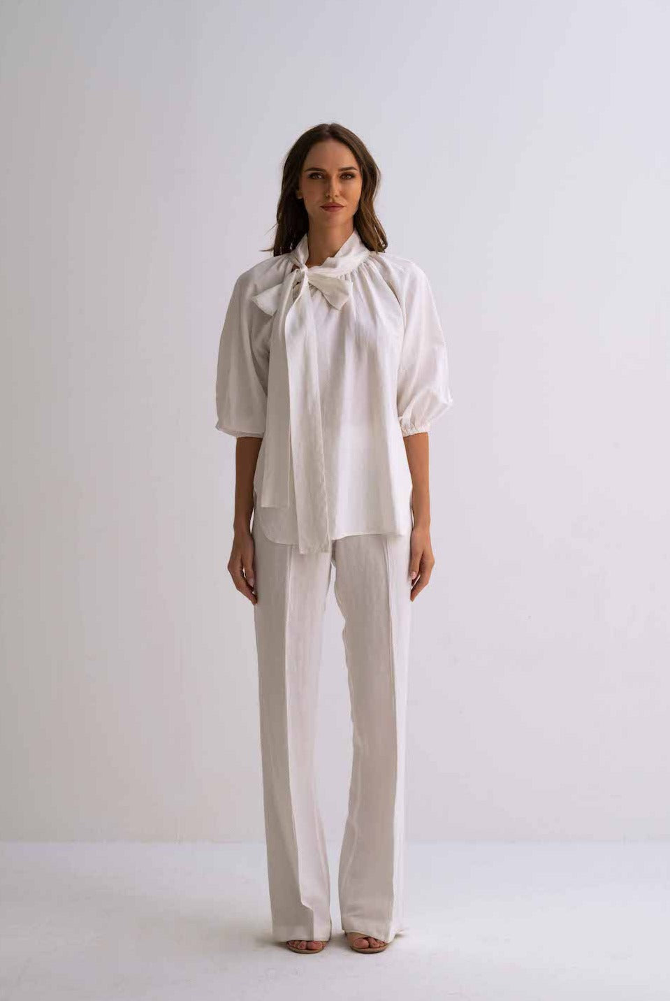 This exceptional blouse design is spellbinding with intricate details, crafted from natural linen fabric with an original and unique texture. The blouse is designed with a side slit and a long loop that ties to the side. Detailing and voluminous puffy sleeves.