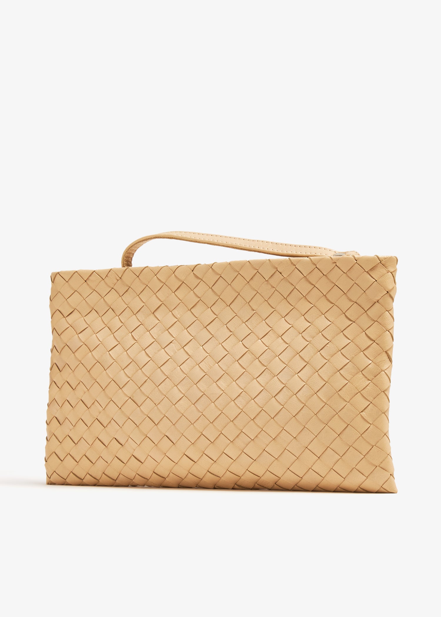 A contemporary look, the hand-woven lambskin beige clutch bag is a compact, practical piece offering a detachable leather wristlet for multiple carry options.
