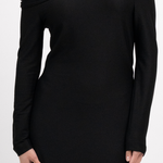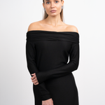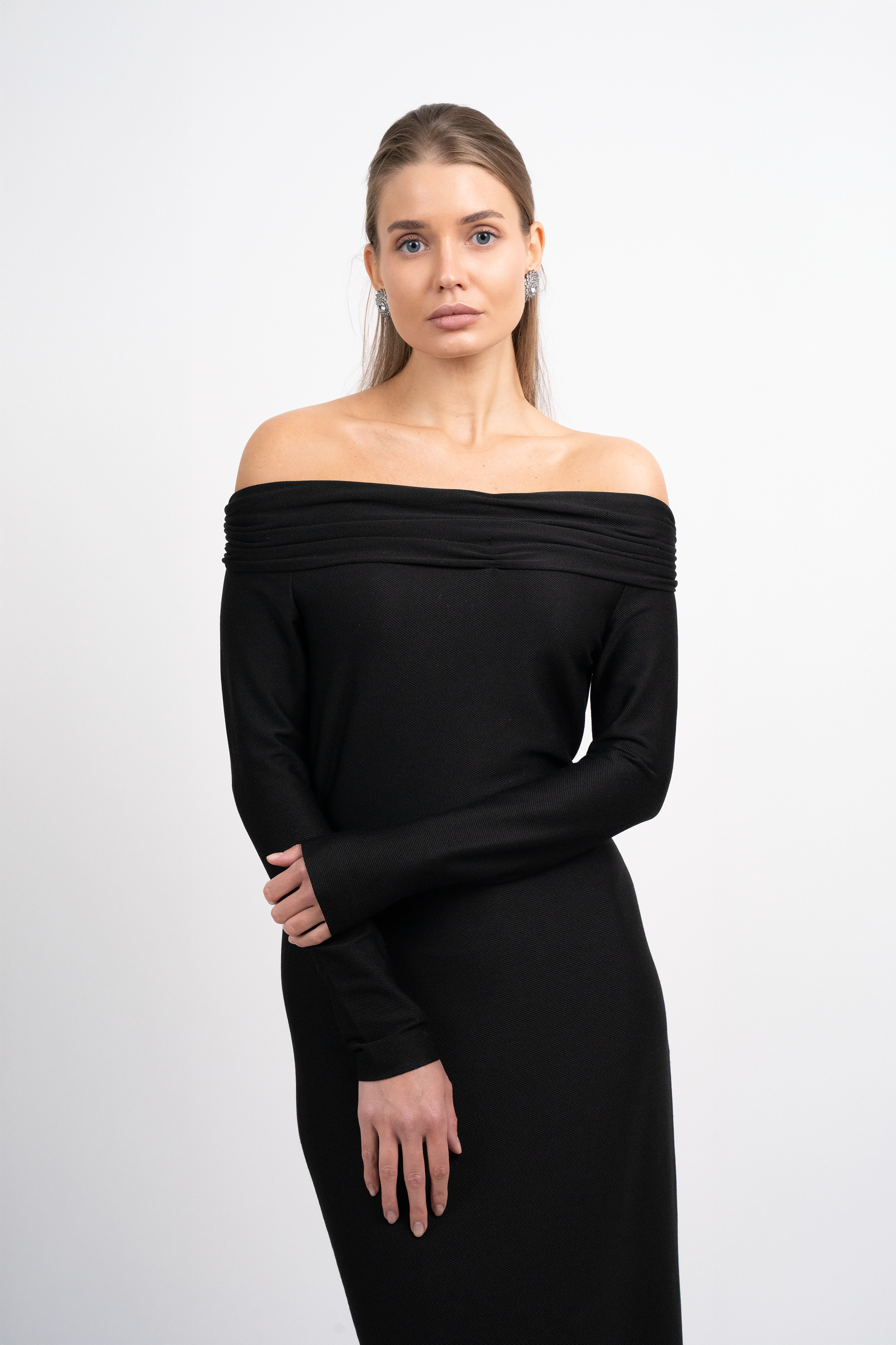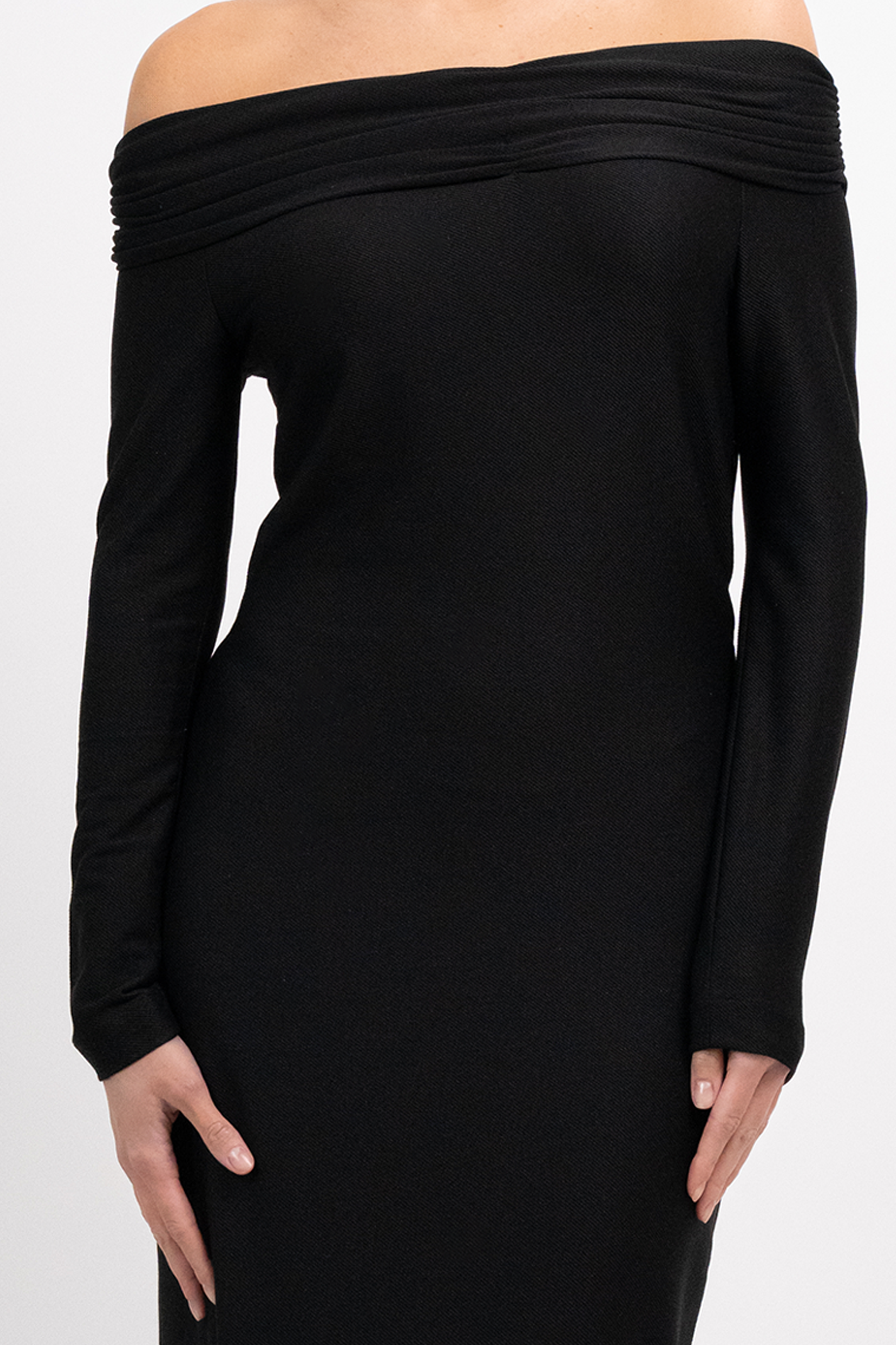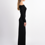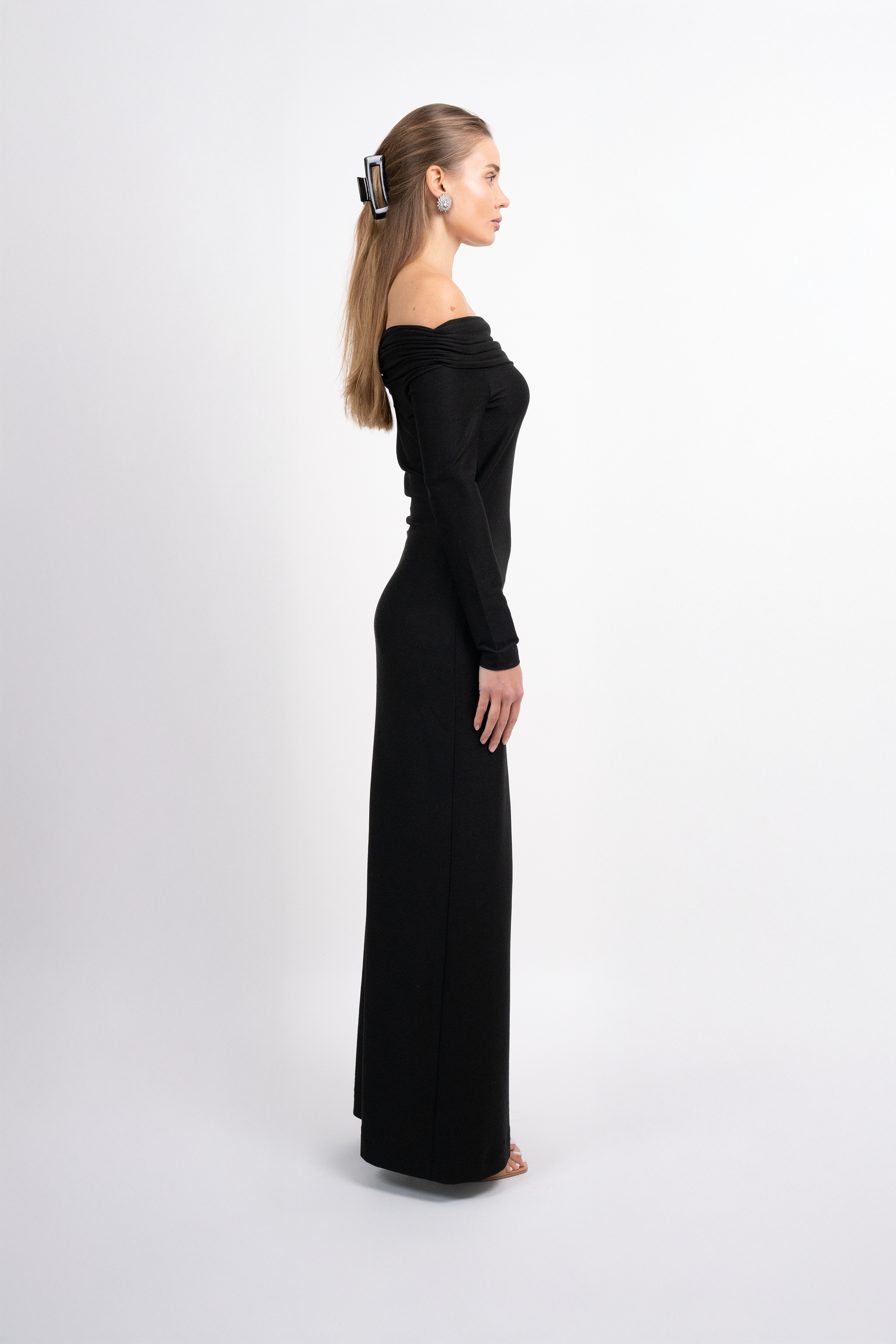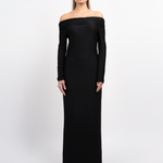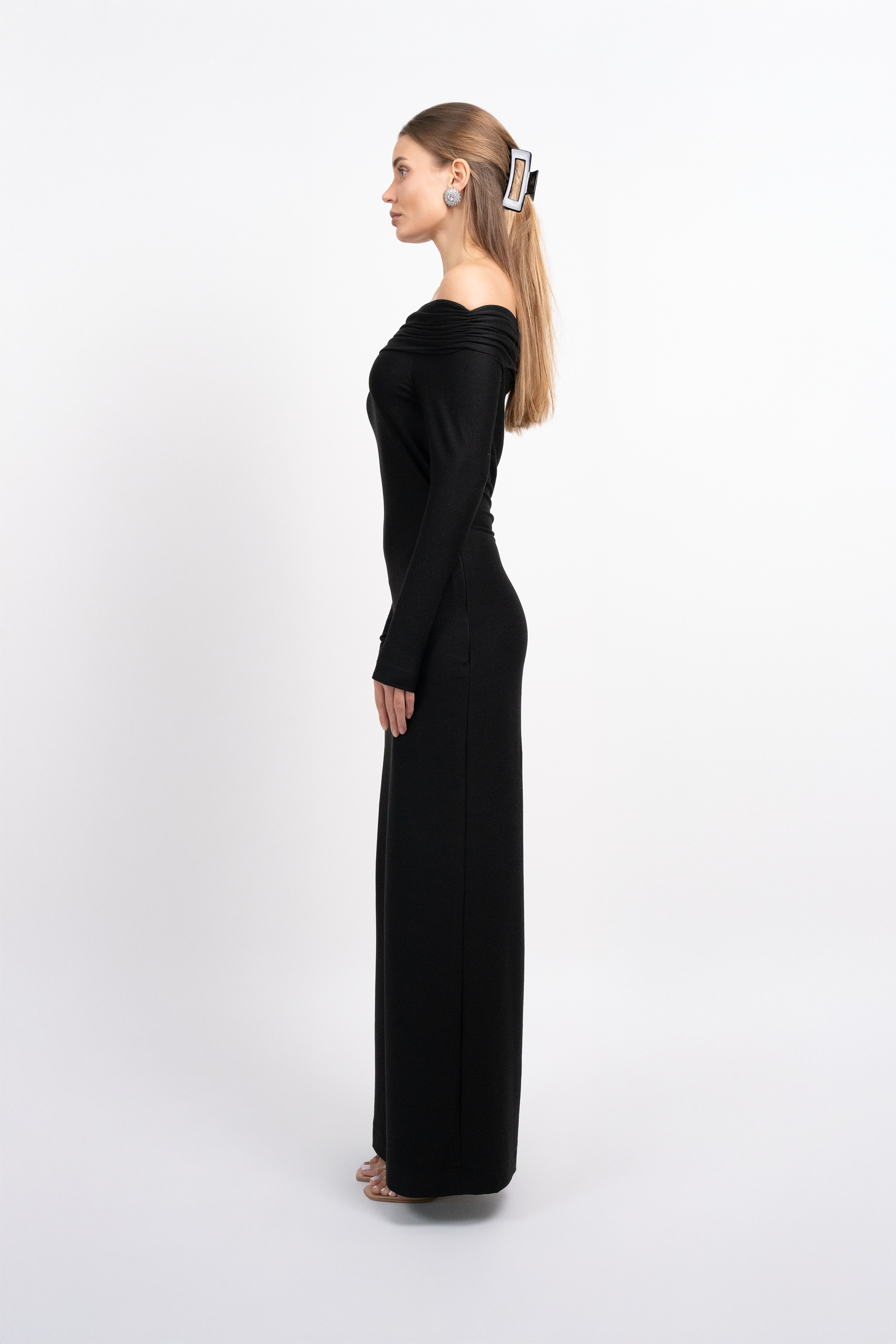 This maxi dress is an inspired re-working of the classic black dress. Crafted from smooth Lycra fabric, the shoulder-baring silhouette is fitted with three-quarter sleeves and skims the figure to a floor-sweeping finish.