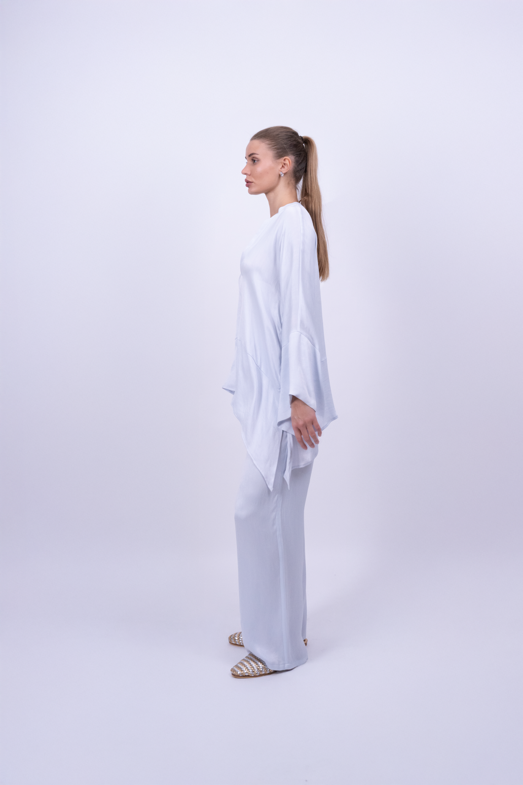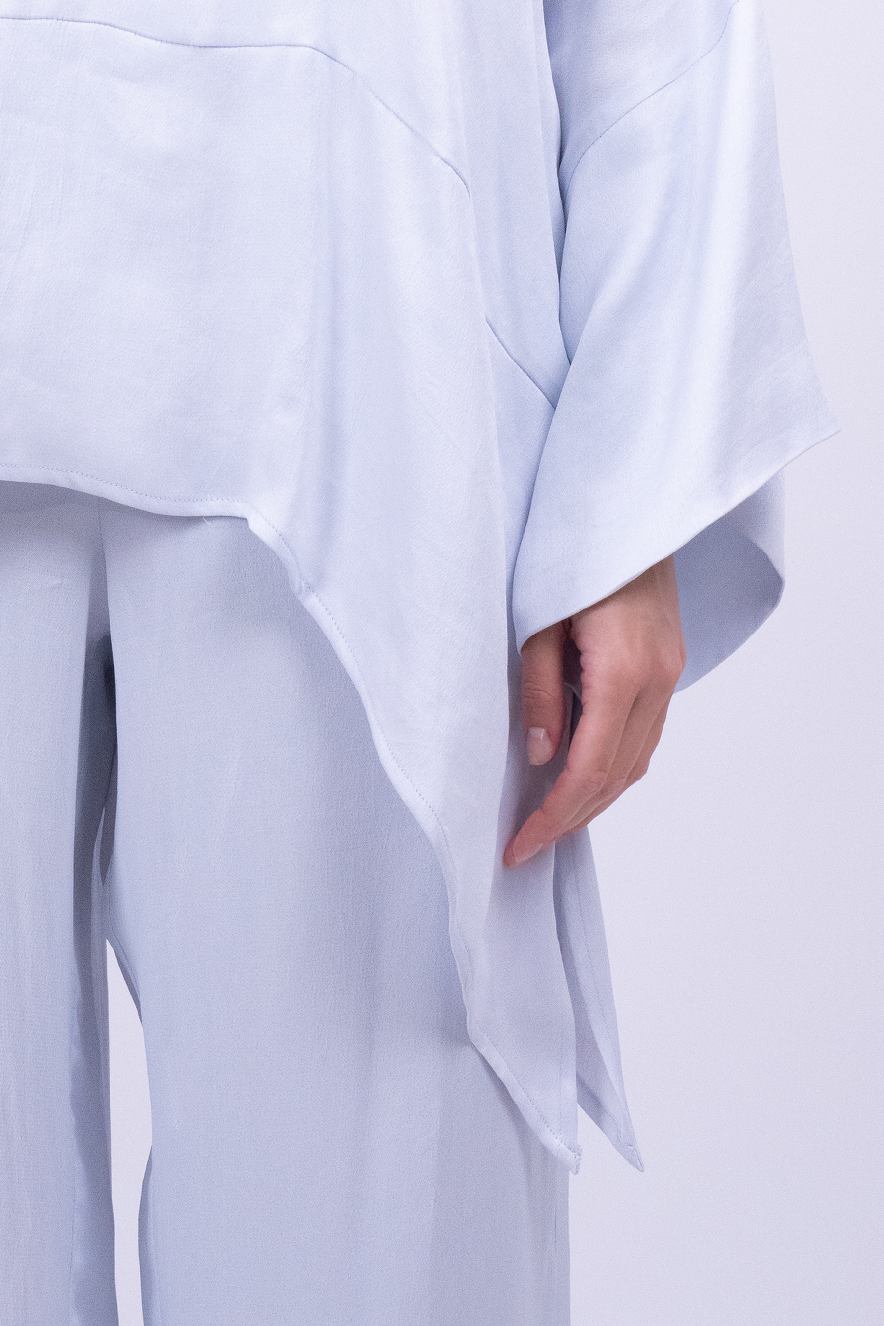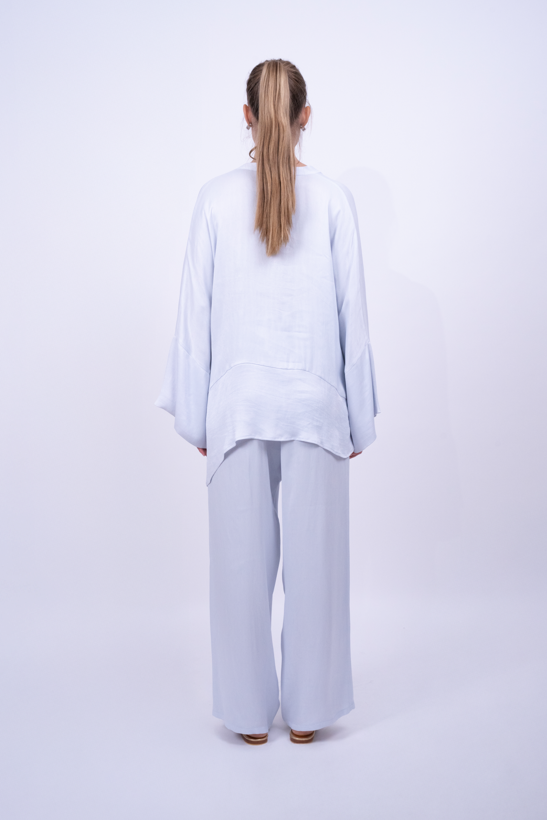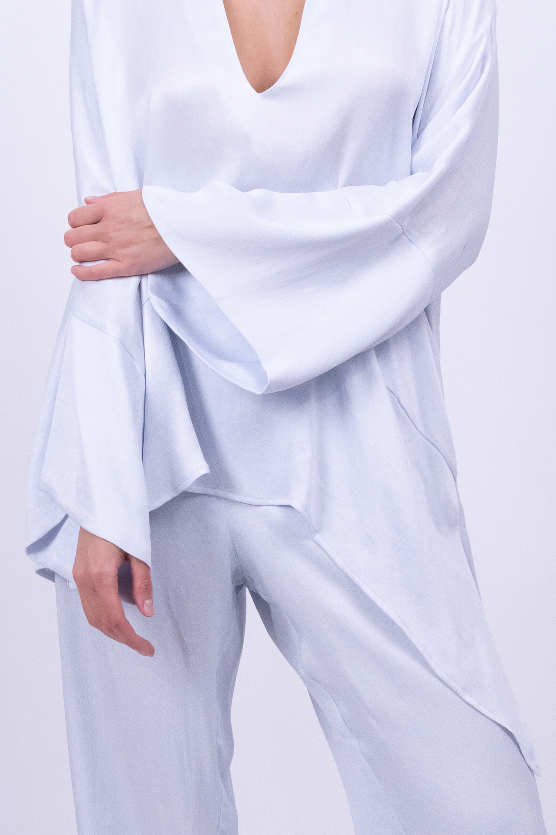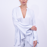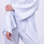 This sky blue silk set combines playful flutter sleeves with luxurious washed satin for an effortlessly chic look. Pair it with high-waist pants or a long skirt—versatile enough for any moment.
