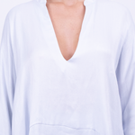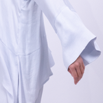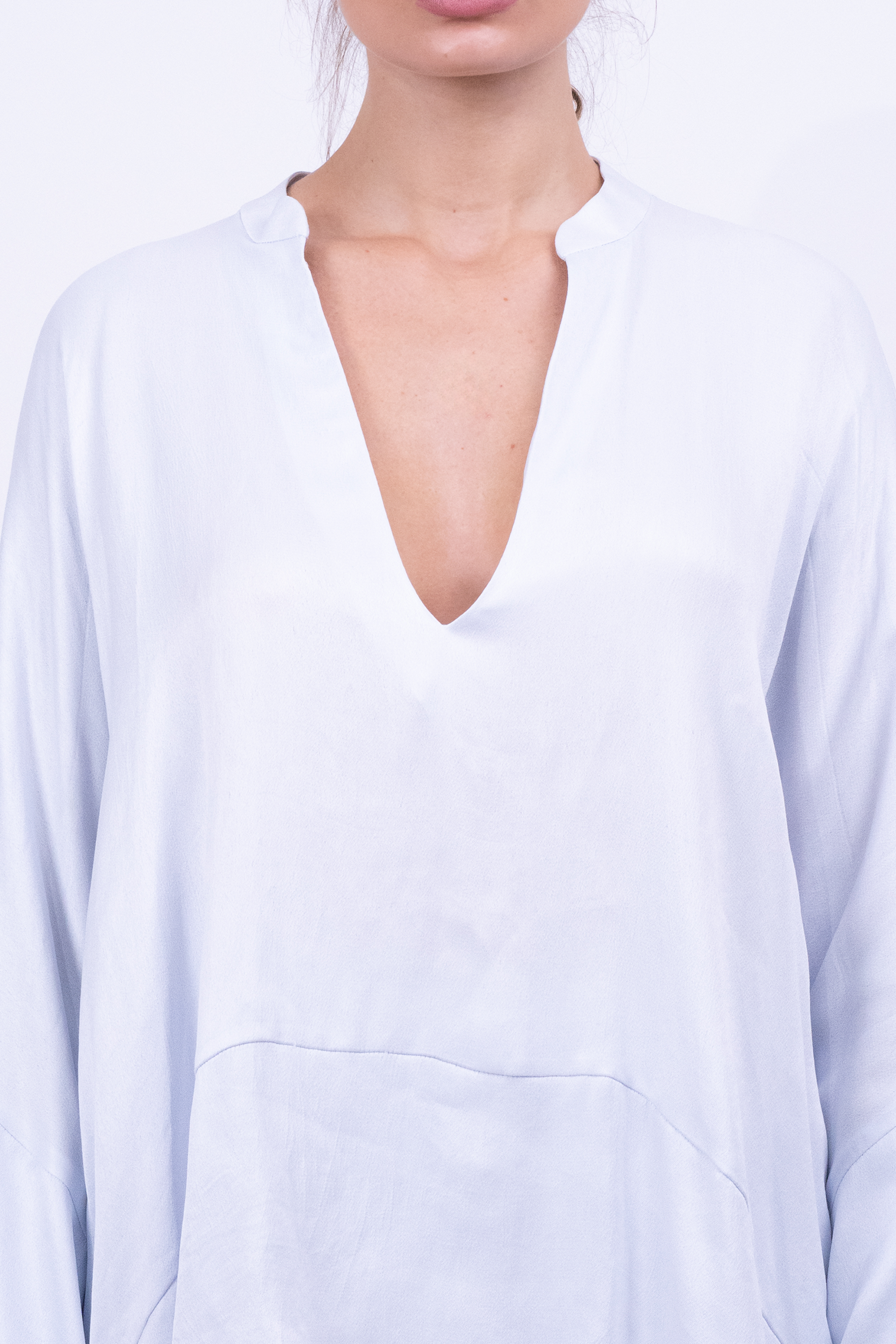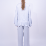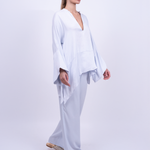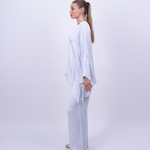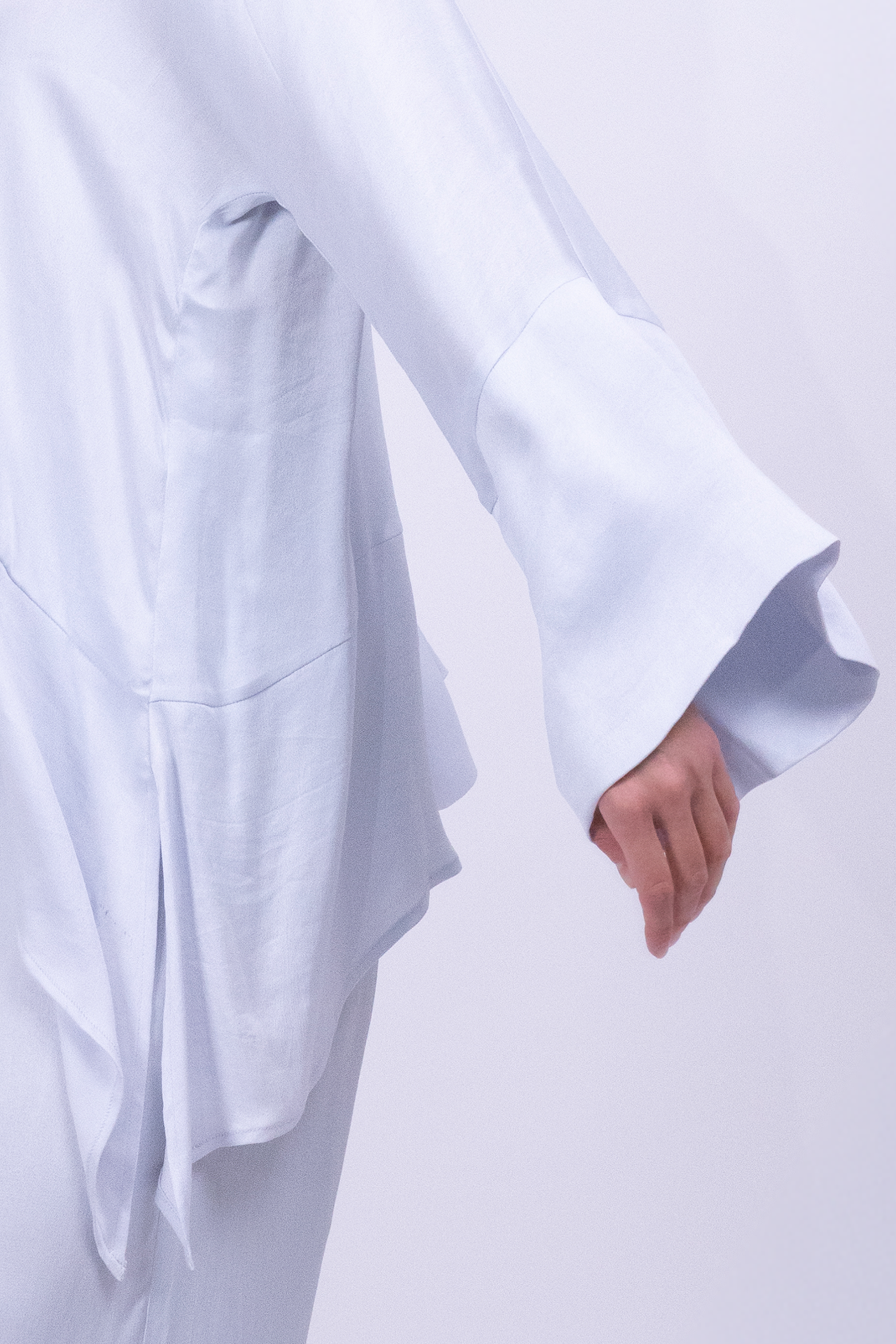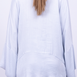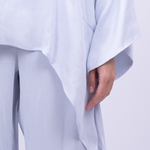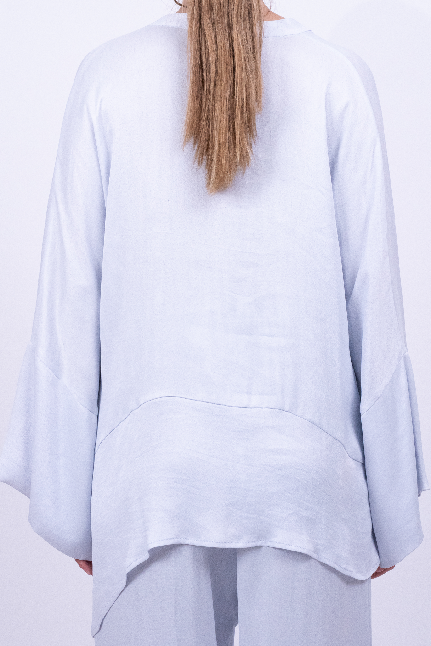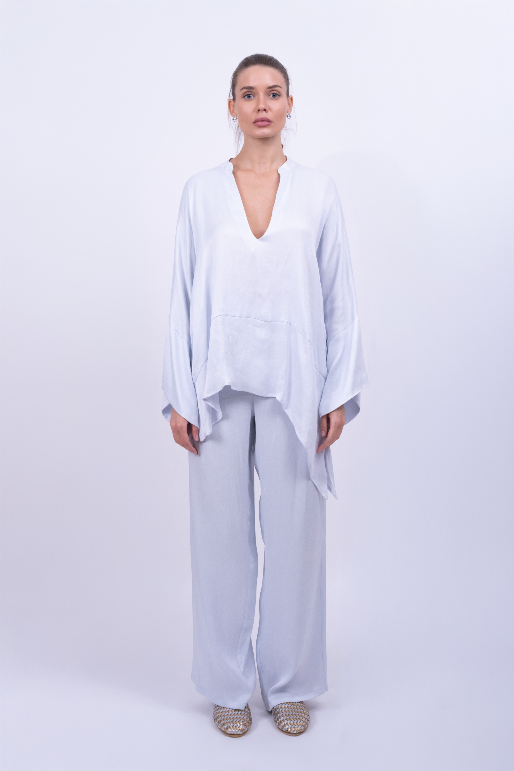 This sky blue silk set combines playful flutter sleeves with luxurious washed satin for an effortlessly chic look. Pair it with high-waist pants or a long skirt—versatile enough for any moment.