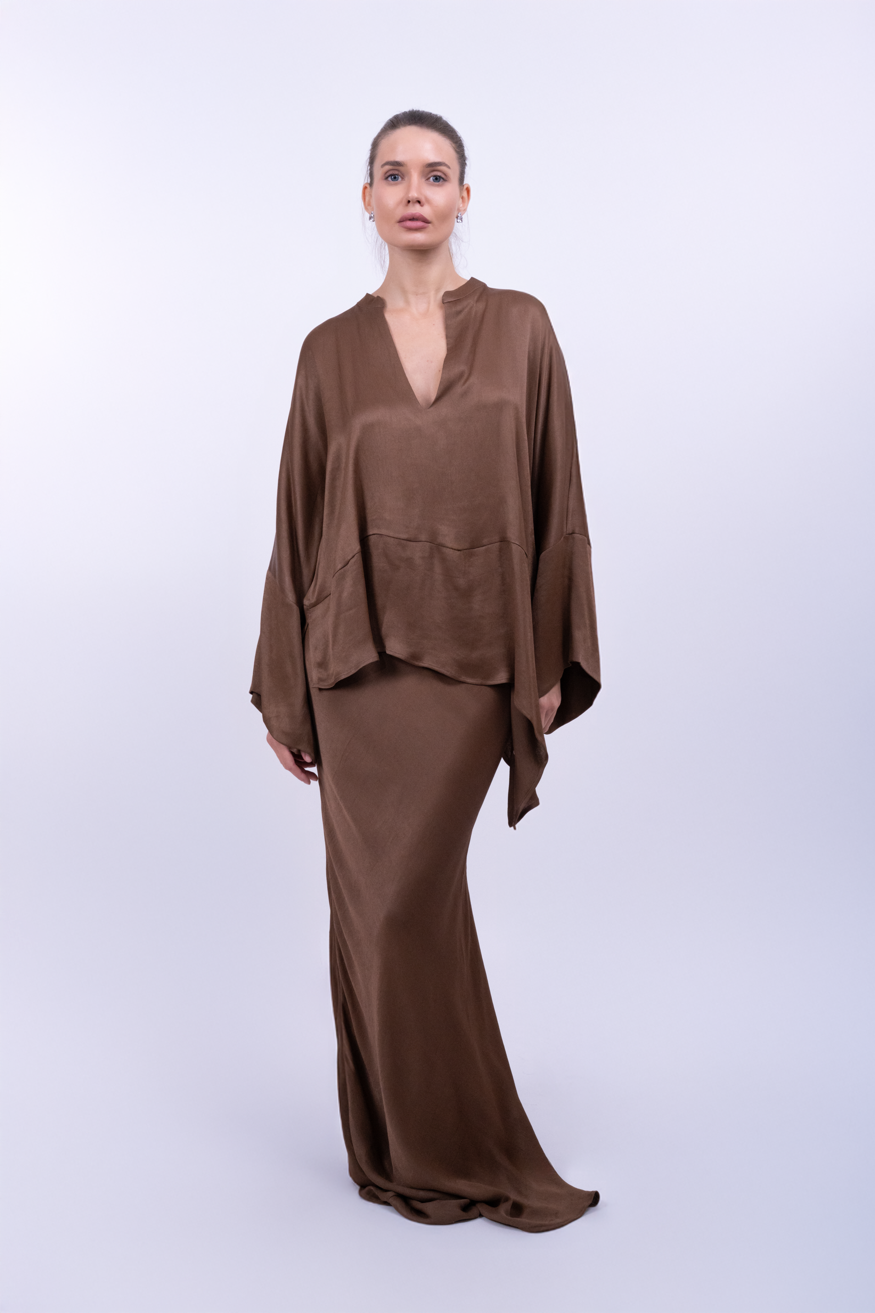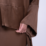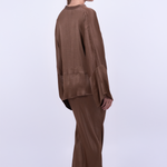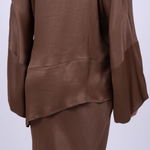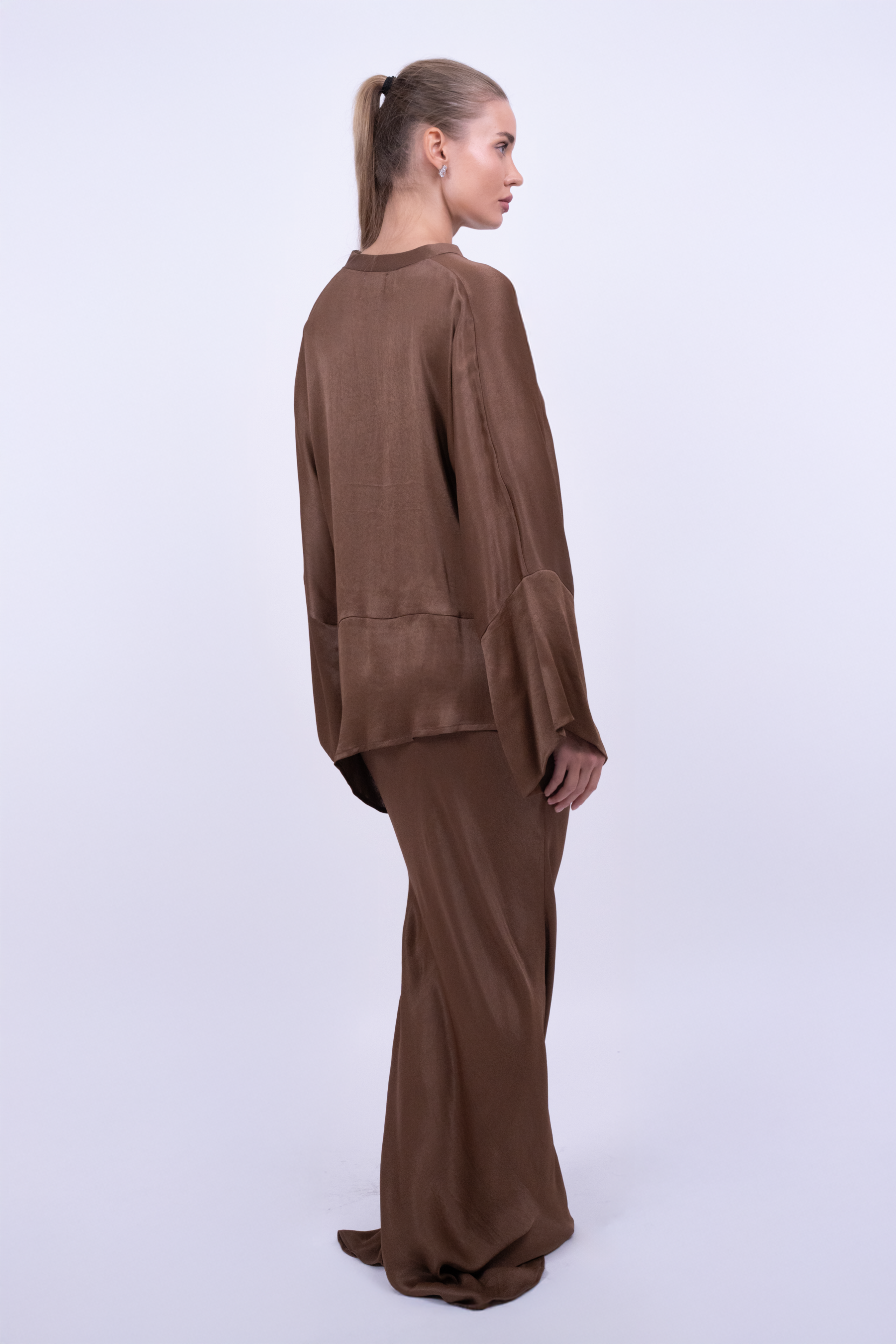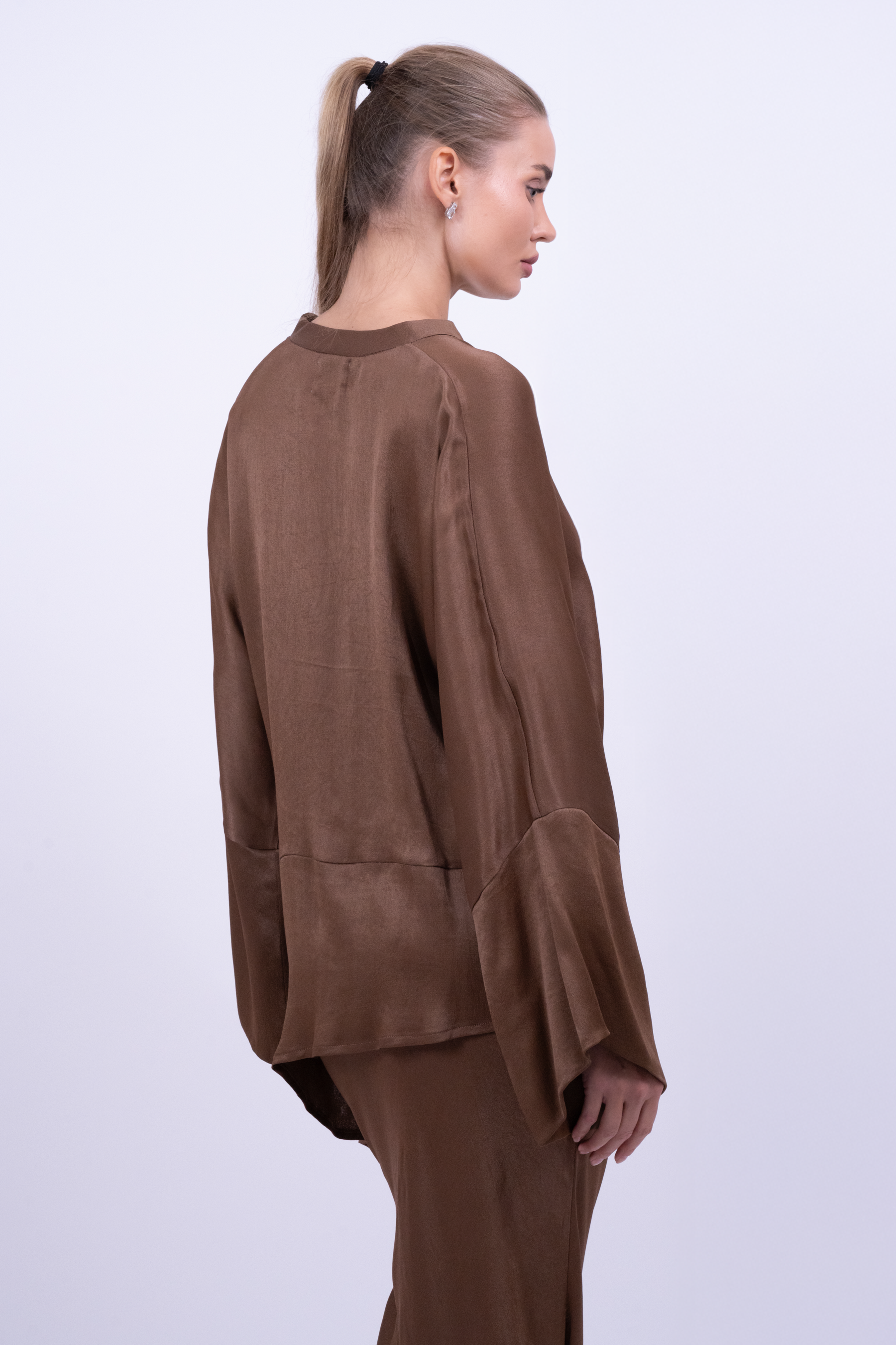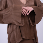 This mocca brown silk set combines playful flutter sleeves with luxurious washed satin for an effortlessly chic look. Pair it with high-waist pants or a long skirt—versatile enough for any moment.