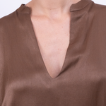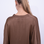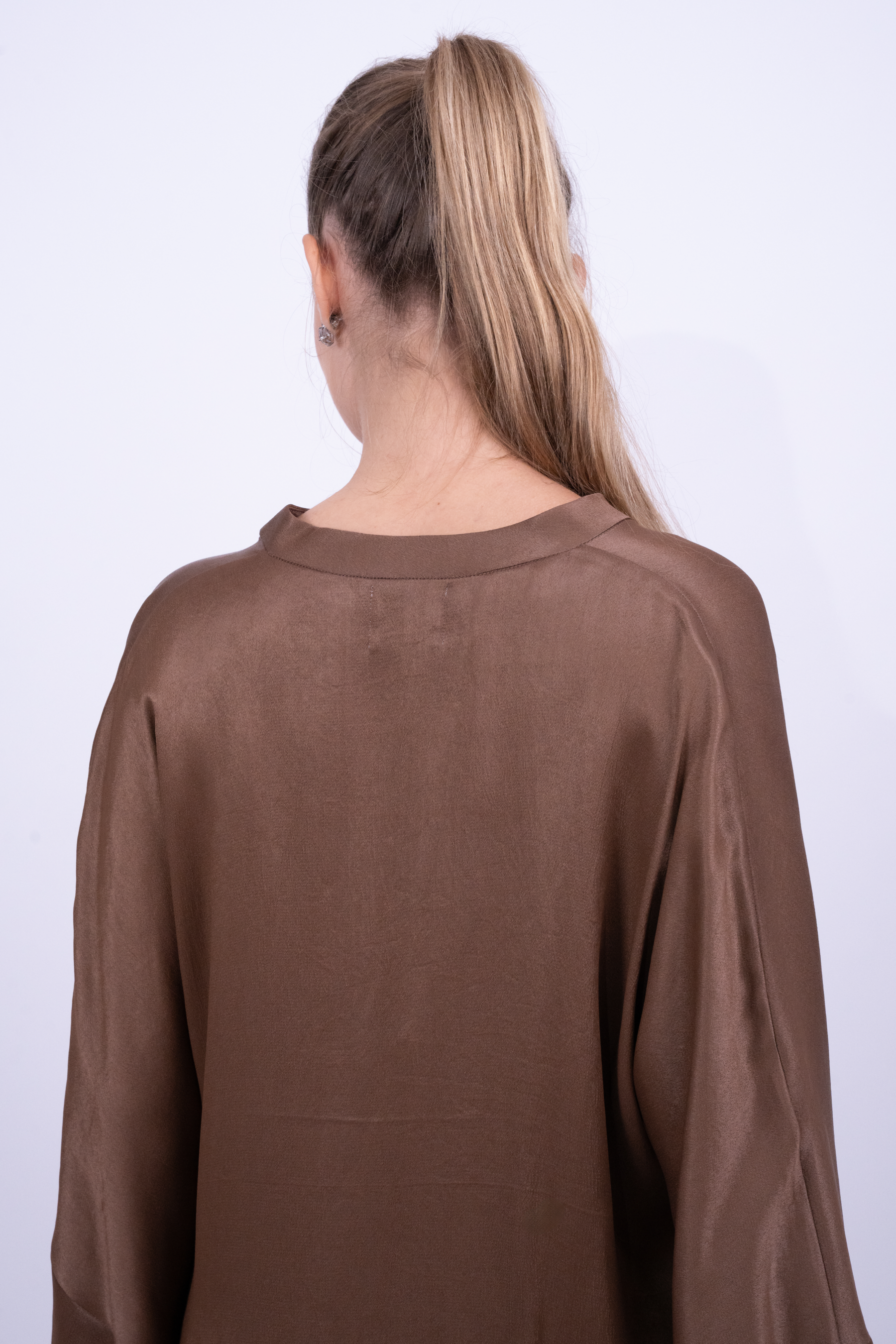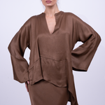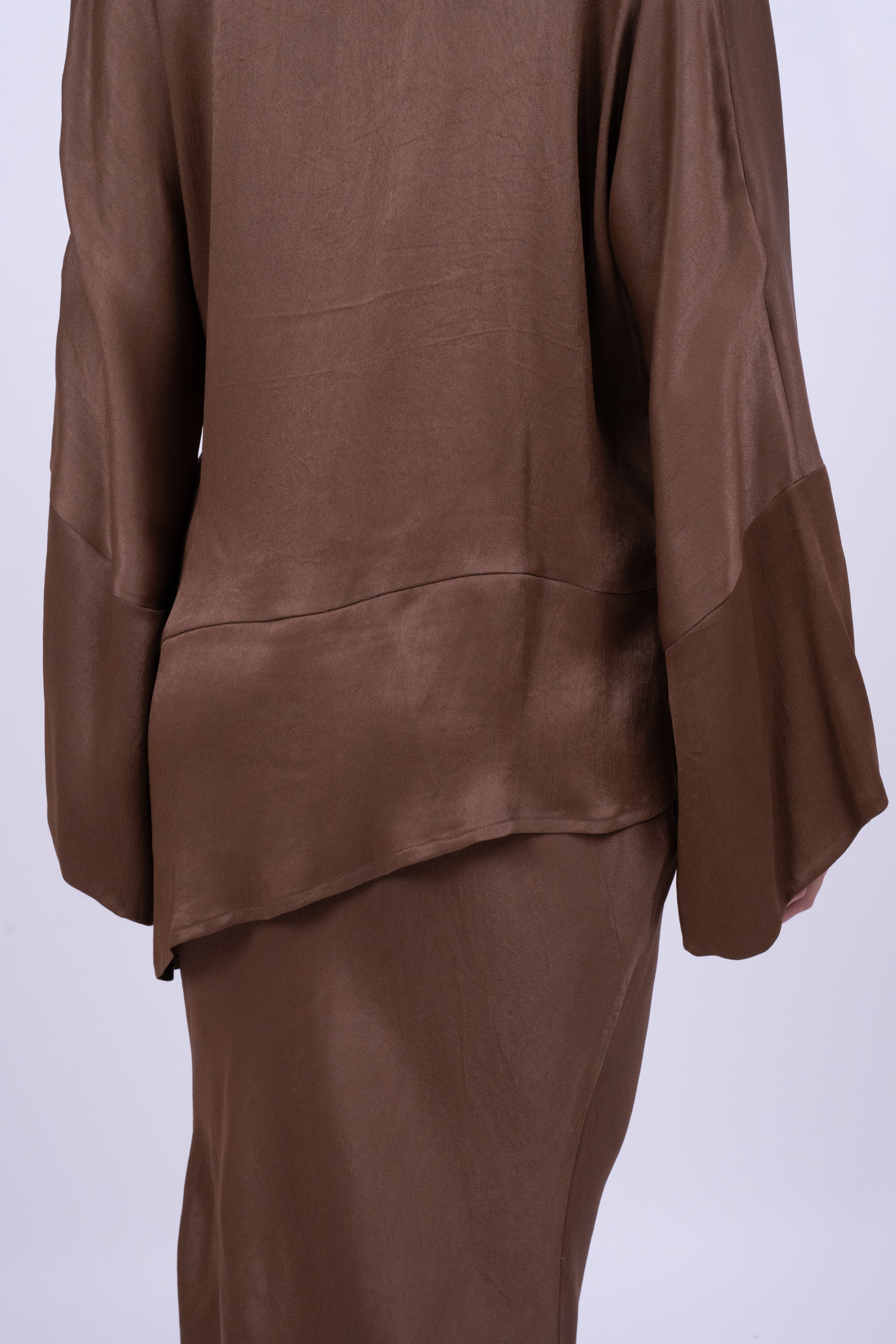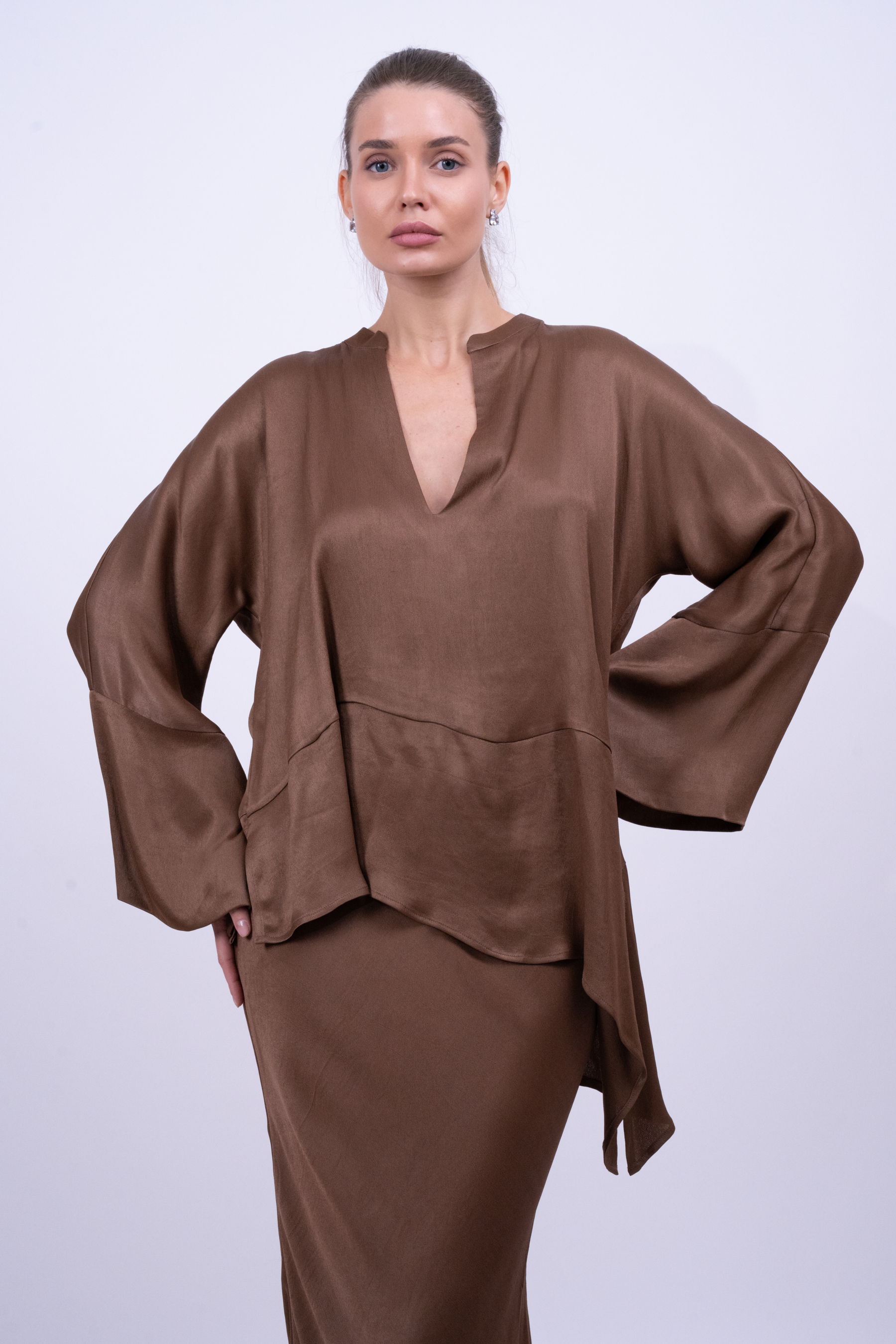 This mocca brown silk set combines playful flutter sleeves with luxurious washed satin for an effortlessly chic look. Pair it with high-waist pants or a long skirt—versatile enough for any moment.