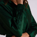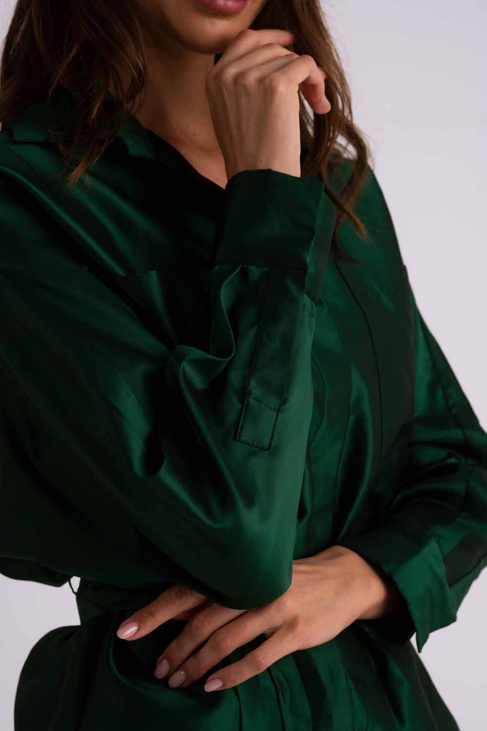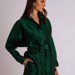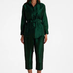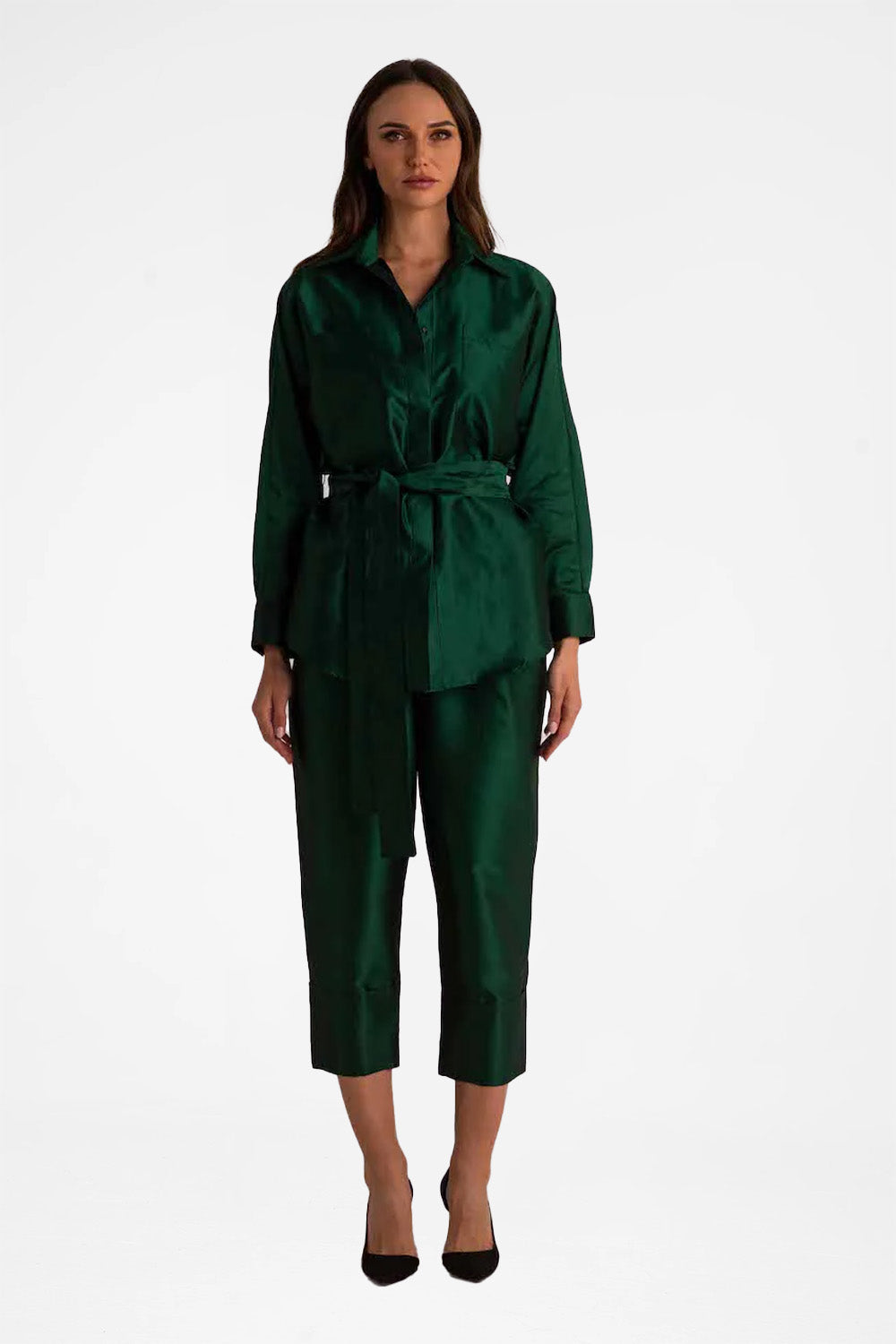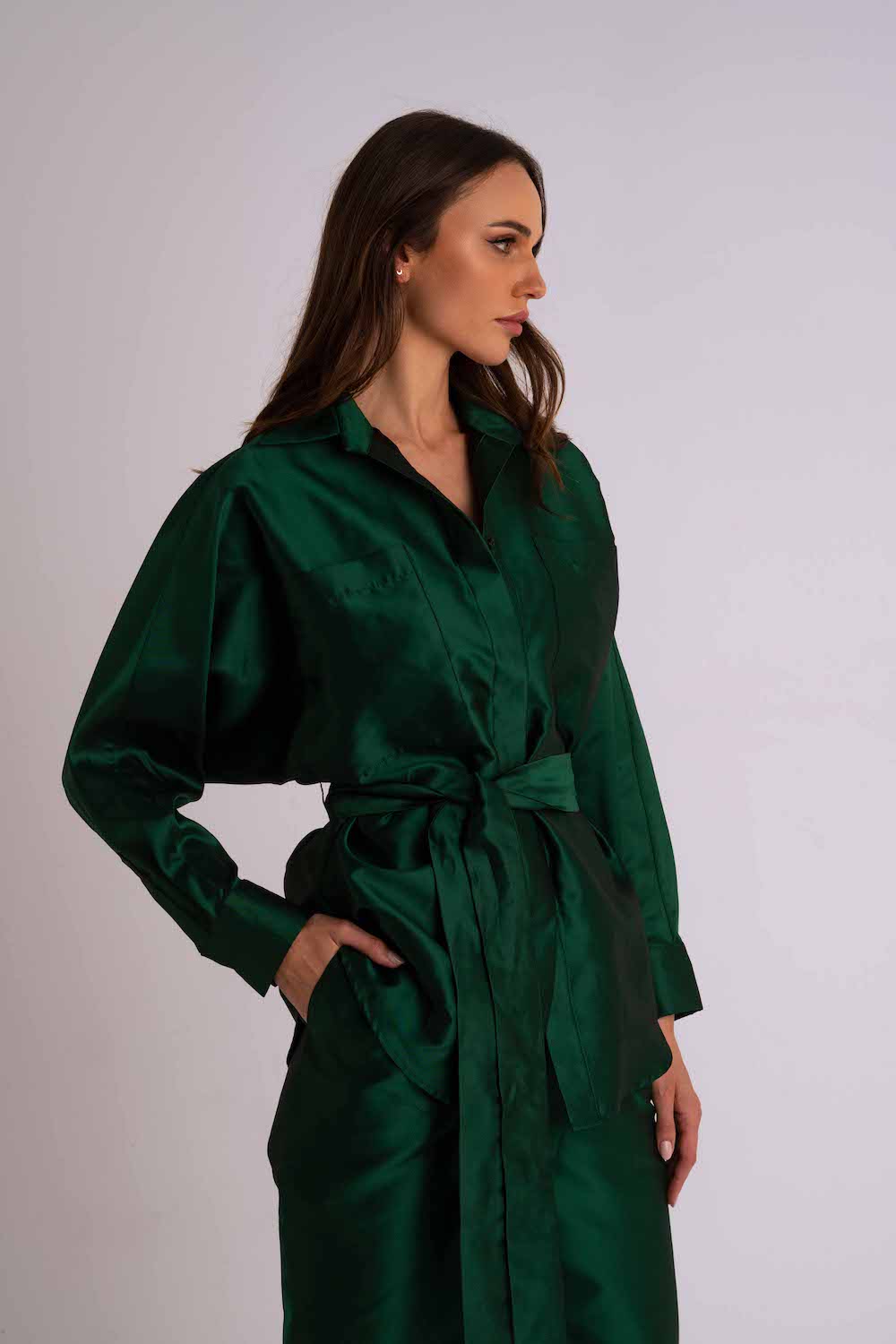 This chic set is inspired by the beauty of the Jungle. With the stunning Green safari outfit you can feel both comfortable and bohemian no matter what day brings you. The set is made from raw silk and has a glistening metallic finish. The jacket can be worn on it's own as a blouse or as a layering jacket with crop top. It features detachable belt that holds the waist in place and two front pockets on the chest.