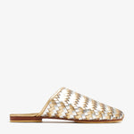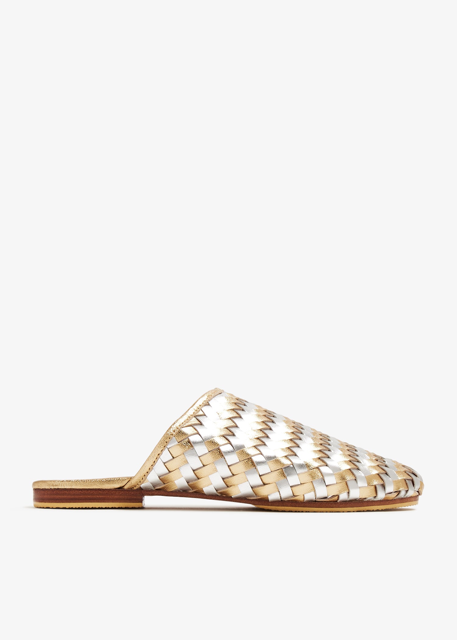 Welcome a fresh twist on the classic slipper design with this handwoven footwear from Cecilehob. These iconic slippers, handwoven lambskin leather in a two-tone metallic design, offer absolute comfort whenever you go, featuring the hand-woven lambskin leather style with a T-shirt and a pair of jeans or your favorite modest wear or maxi dress.