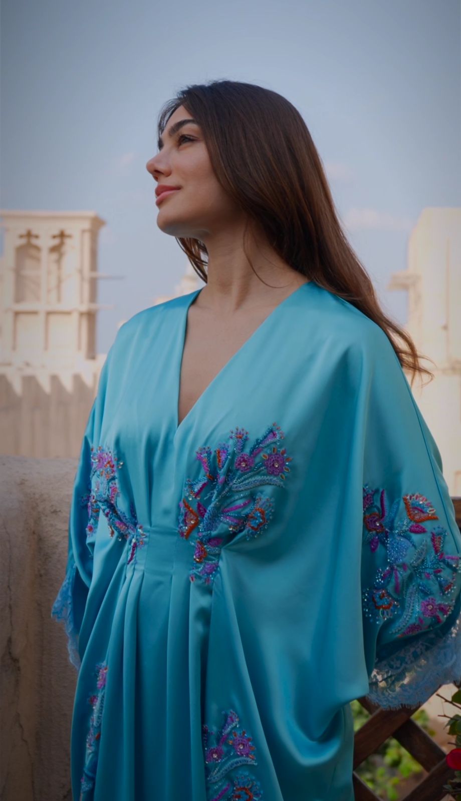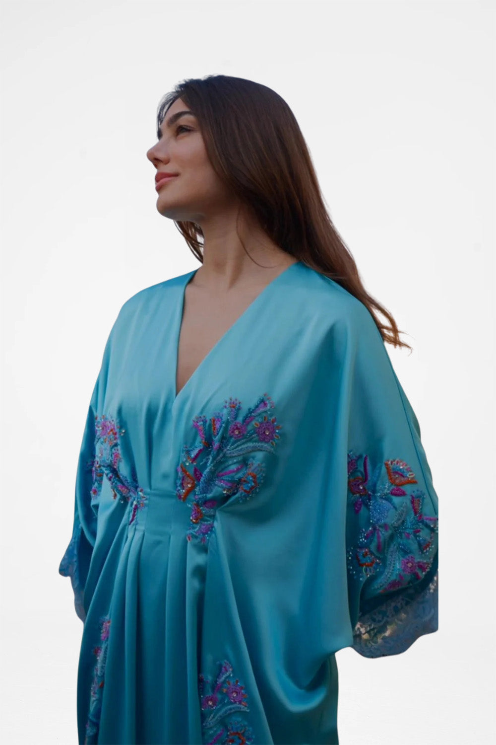 This collection is a limited edition. Each kaftan is unique and sophisticated for an unforgettable gathering evening. The soft satin stretch is incredibly Luxurious, combined with the flower hand-embroidery design. With an adjustable belt on the waist.
